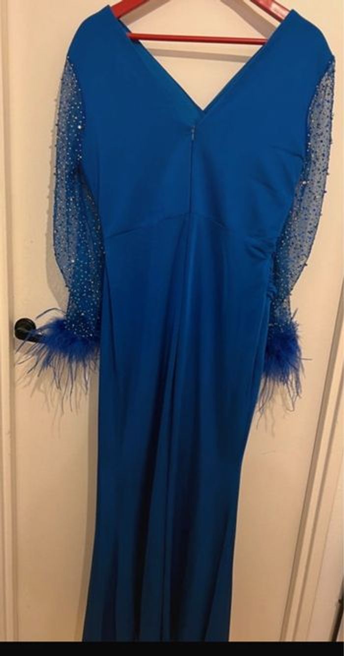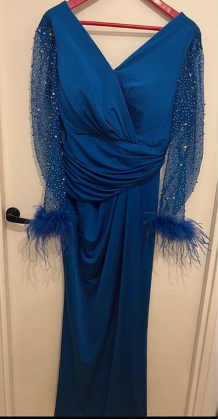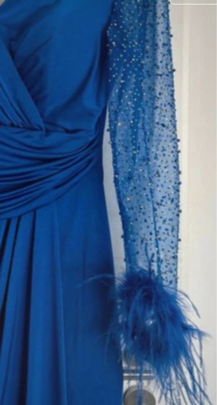 Robe longue bleue élégante à manches ornées de strass et plumes, fente avant – tissu fluide (taille indiquée 48, convient mieux à un 46) Le prix est négociable.
