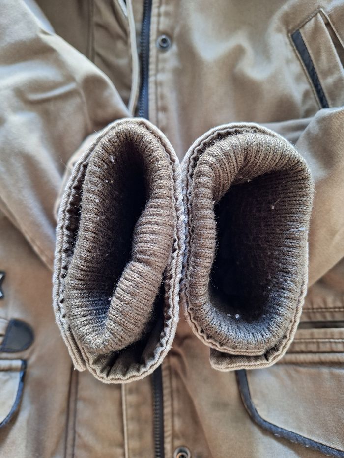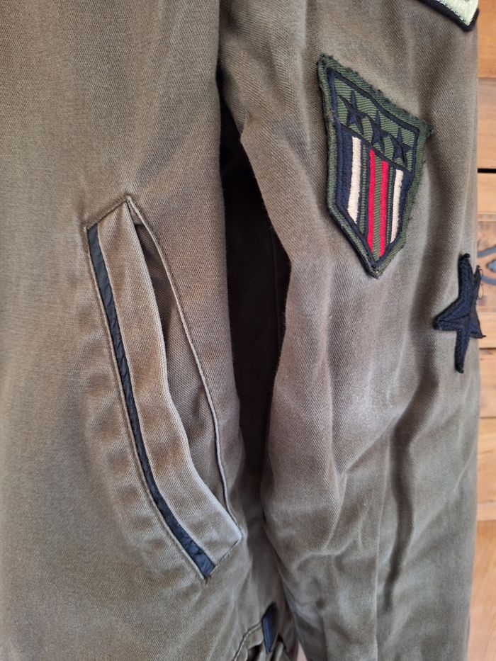Parka avec capuche non amovible - interieur fine polaire - taille XS - couleur kaki passé à certains endroits - fermeture zippée avec rabat pression - traces d'usure ou de frottement (cf photos) - 1 poche intérieure - 2 poches poitrine et 4 poches plaquées sur le devant - 1 sangle intérieure pour la porter par dessus les épaules (cf photo) - longueur dos : 76 cm - largeur aisselle : 55 cm - long manche : 62 cm - n'hésitez pas à me demander des précisions.