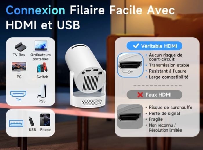 Compatible avec HDMI, USB, PC, tablettes, clés USB, consoles PS, etc.