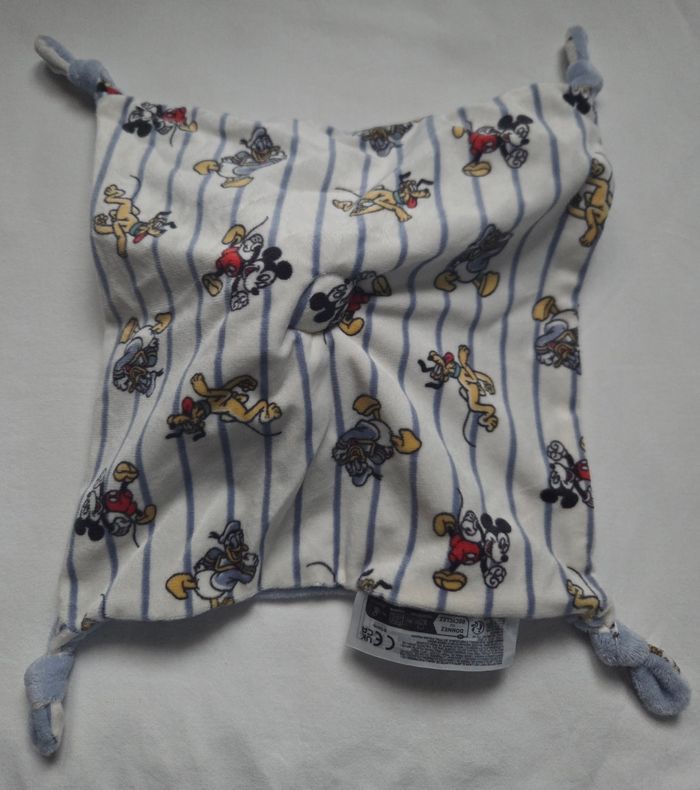 Doudou carré plat en velours de couleur bleu et de l'autre côté en velours de couleur blanc et bleu rayé avec motifs Mickey , Donald et Pluto.