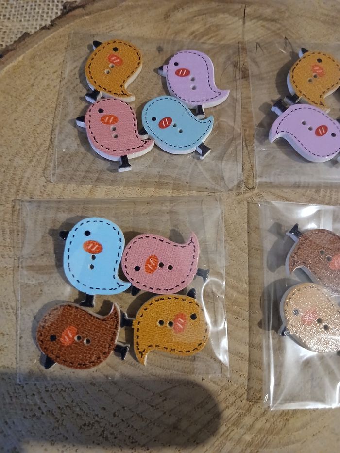 Lot de 4 sachets de boutons en bois oiseaux. D'autres tissus ruban boutons perles et accessoires biais ect... de dispo ds mon dressing n'hésitez pas à jeter un coup d'œil ou à me demander.