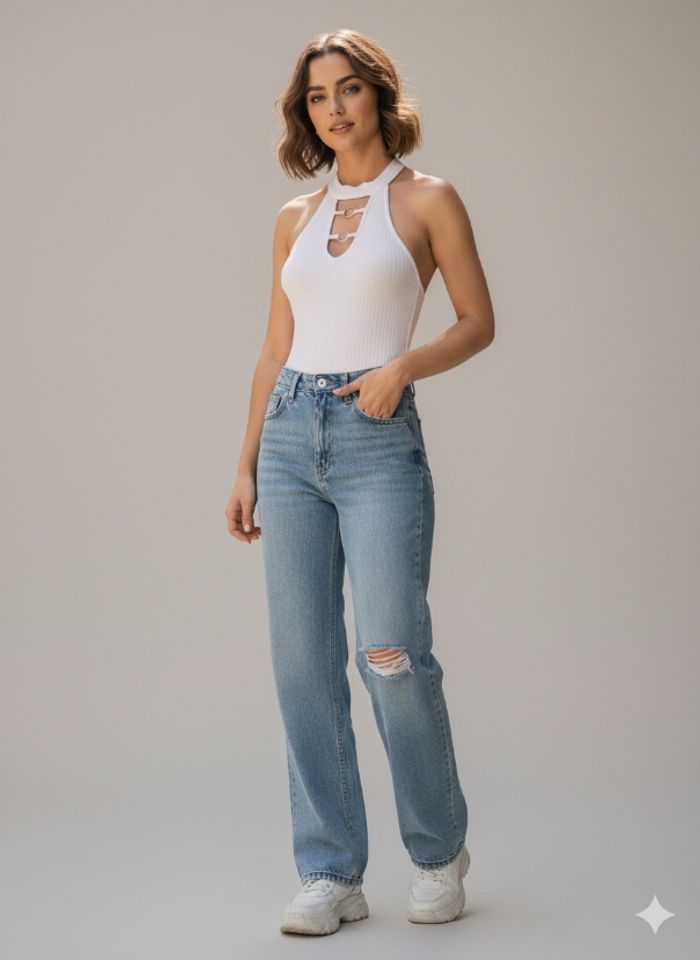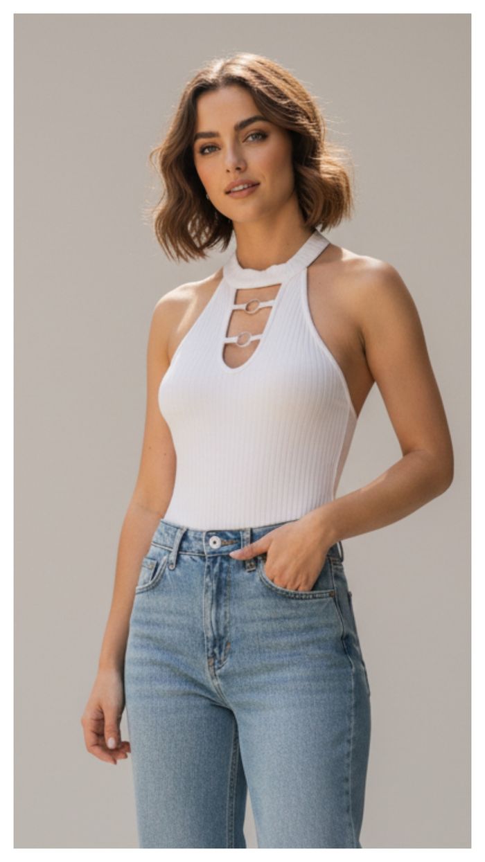 Col montant style halter et détails anneaux dorés à l'encolure pour une touche chic et sexy. Idéal pour un look de jour ou de soirée !