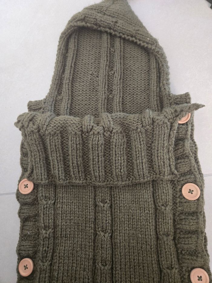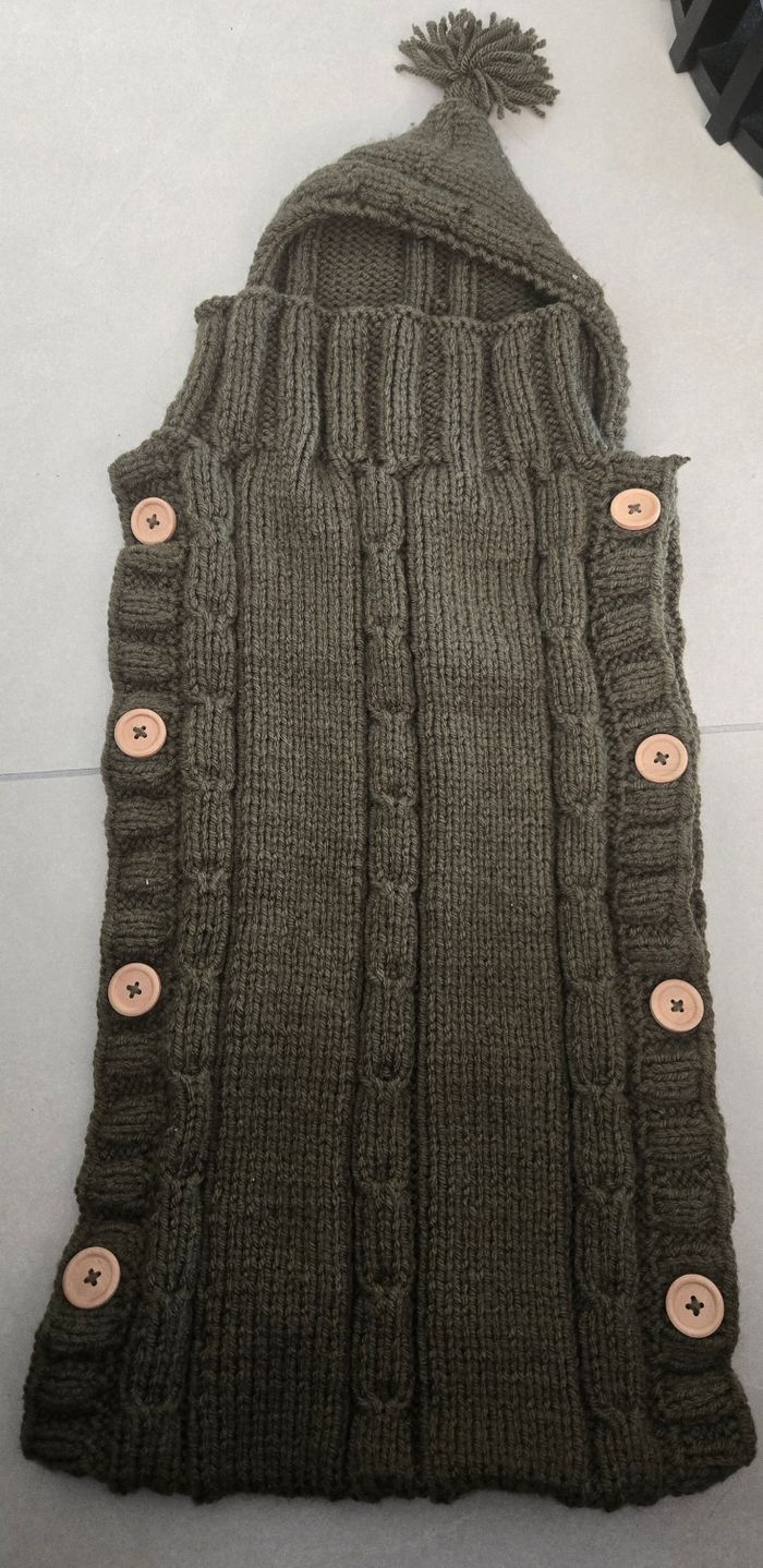 Magnifique gigoteuse ou nid d'ange en tricot épais avec une capuche et un pompon, parfait pour garder bébé au chaud en hiver, dans le berceau ou en promenade.