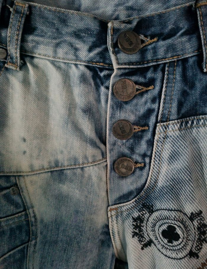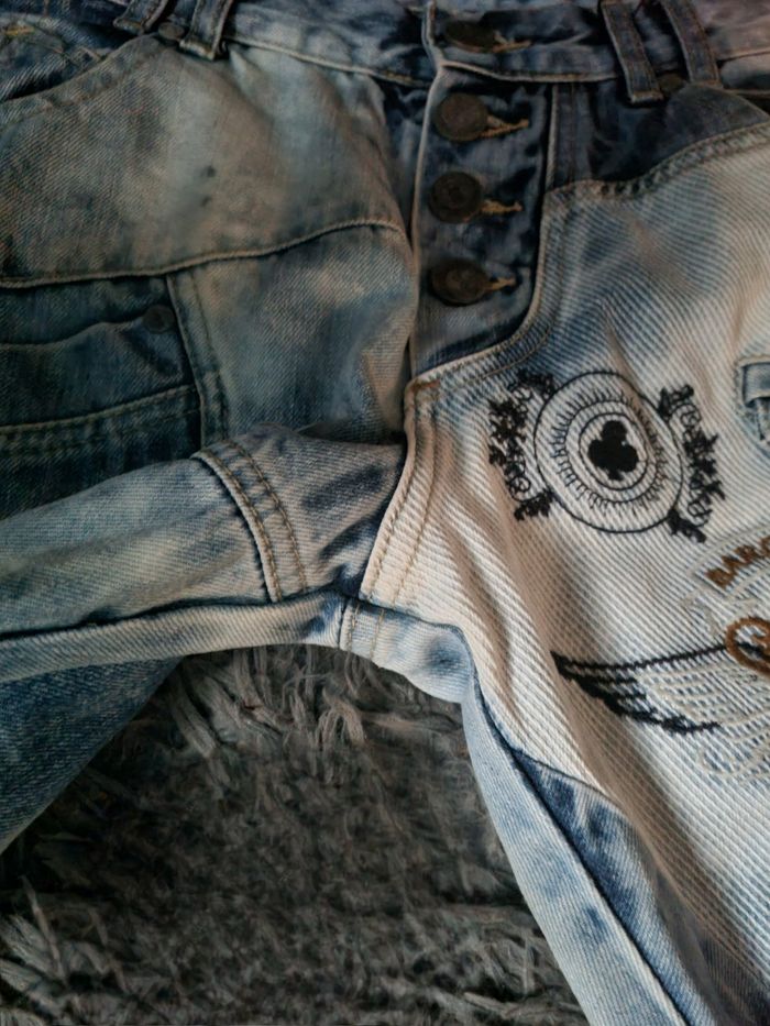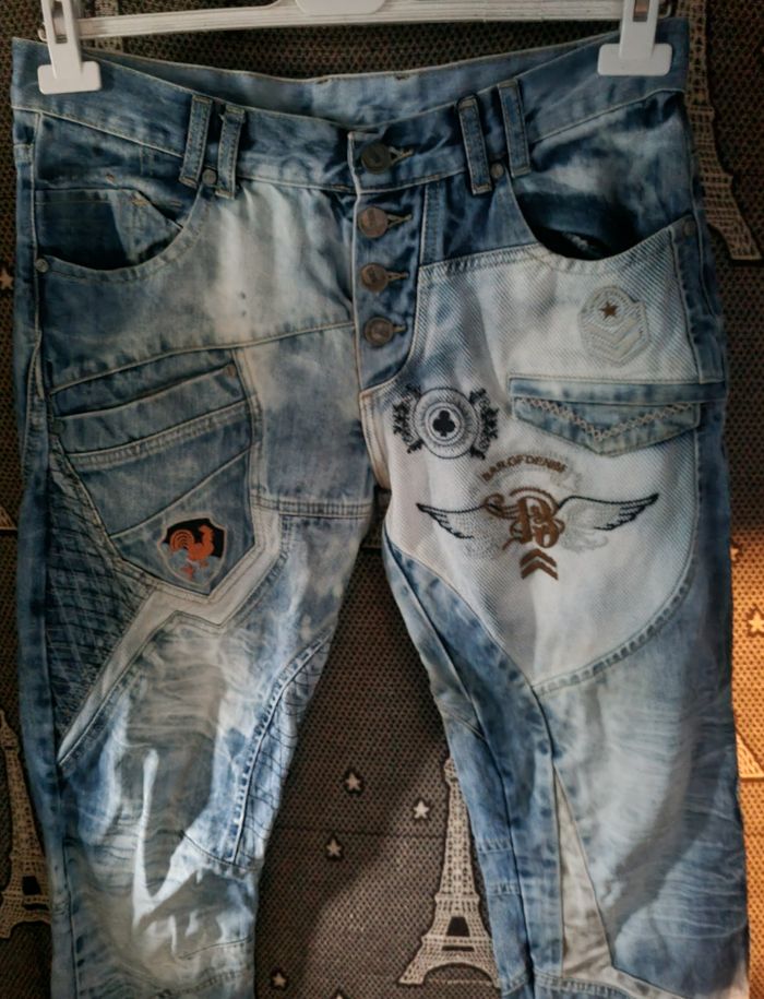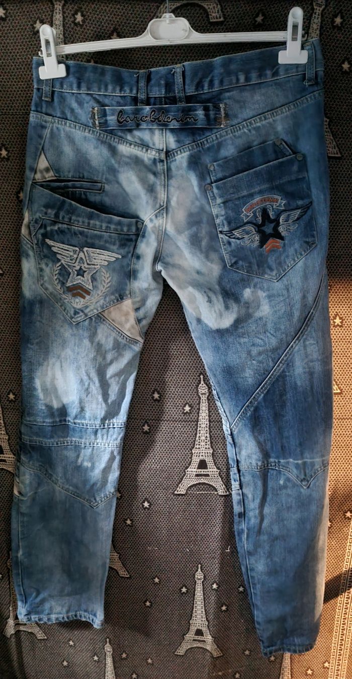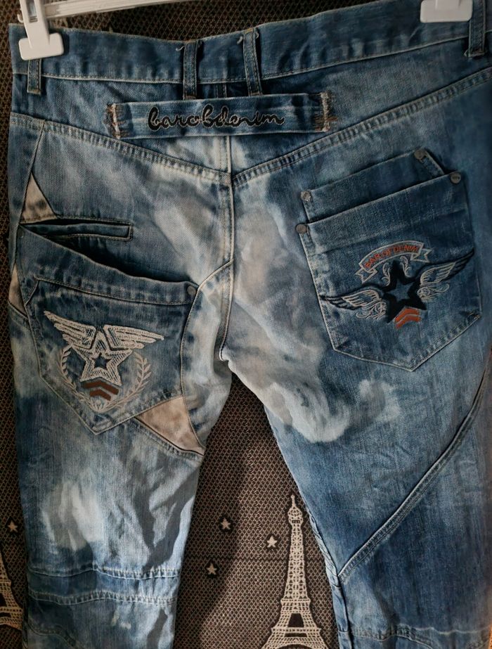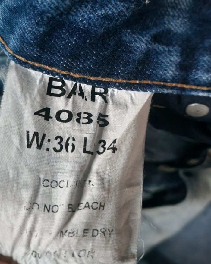 Jean effet délavé style baggy, fermeture boutons, taille w36 l34 (46Fr) marque Bar Of Denim, 6 vrais poches et 2 fausse poches, longueur 108cm,largeur de la taille 44cm, largeur cuisse 30cm, largeur cheville 18cm, quelques légère taches voir les 2 dernières photos.
