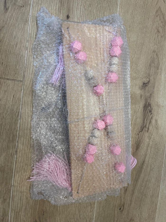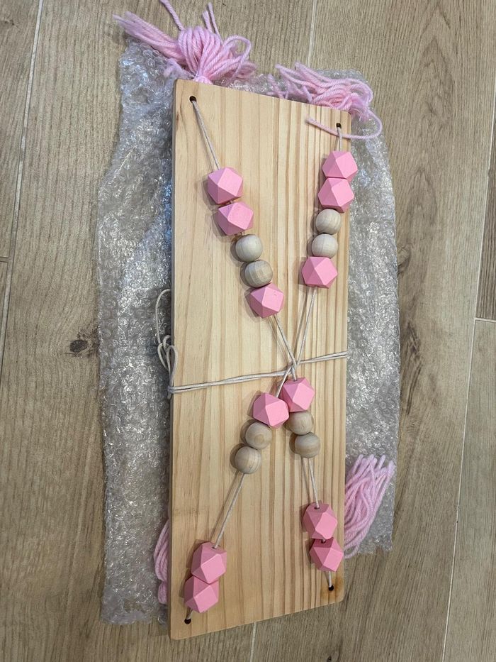 Jolie étagère en bois décorée de perles en bois roses et naturelles, tenue par une corde élégante. Parfaite pour apporter une touche douce et chaleureuse à une chambre de bébé fille. Neuve, jamais utilisée.