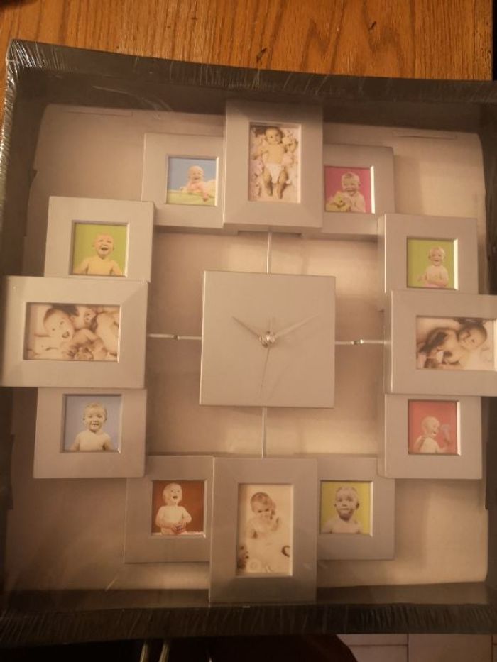 Article neuf jamais servi. Horloge 40x40 possédant des petits cadres où des photos peuvent être mises