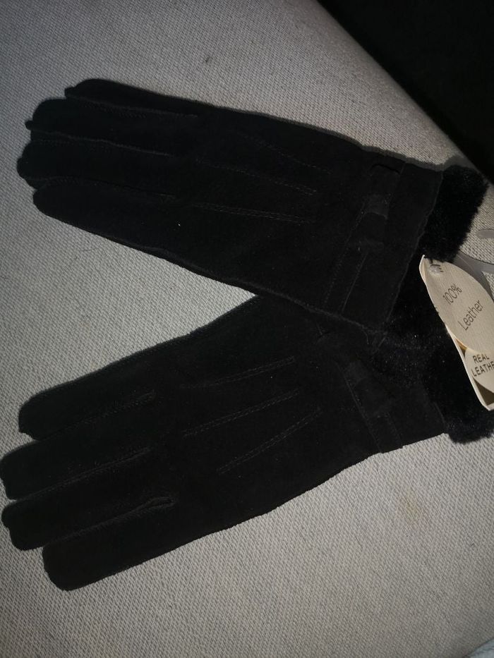 Gants en cuir retourné. Petit noeud devant. Fourrure intérieure. Article neuf. Taille S