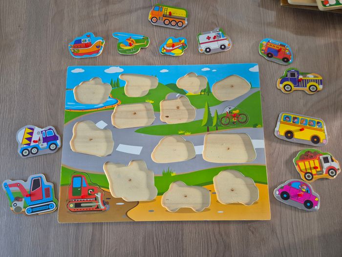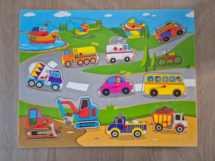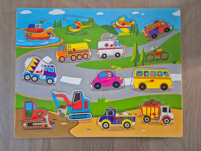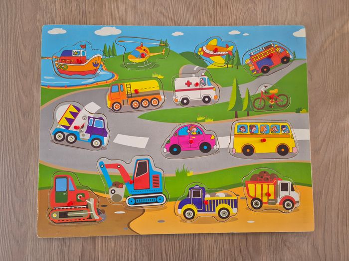 Un joli puzzle en bois sur le thème des moyens de transport : voiture, bus, hélicoptère, camion de pompier, vélo, bateau, pelleteuse, et bien d’autres !