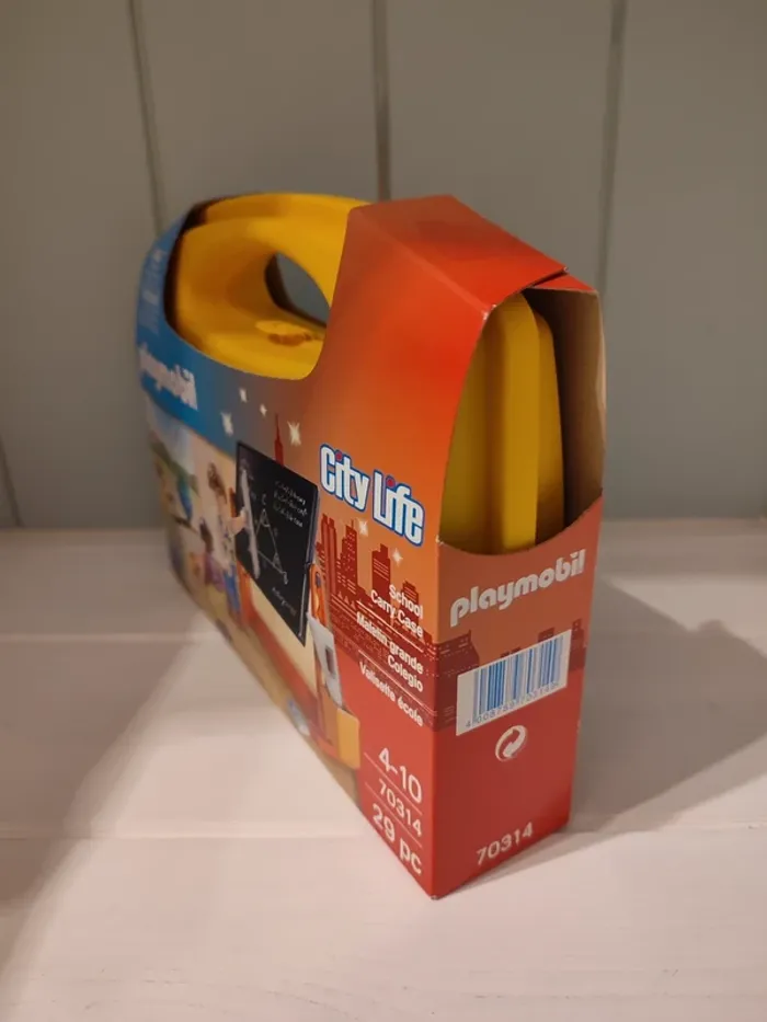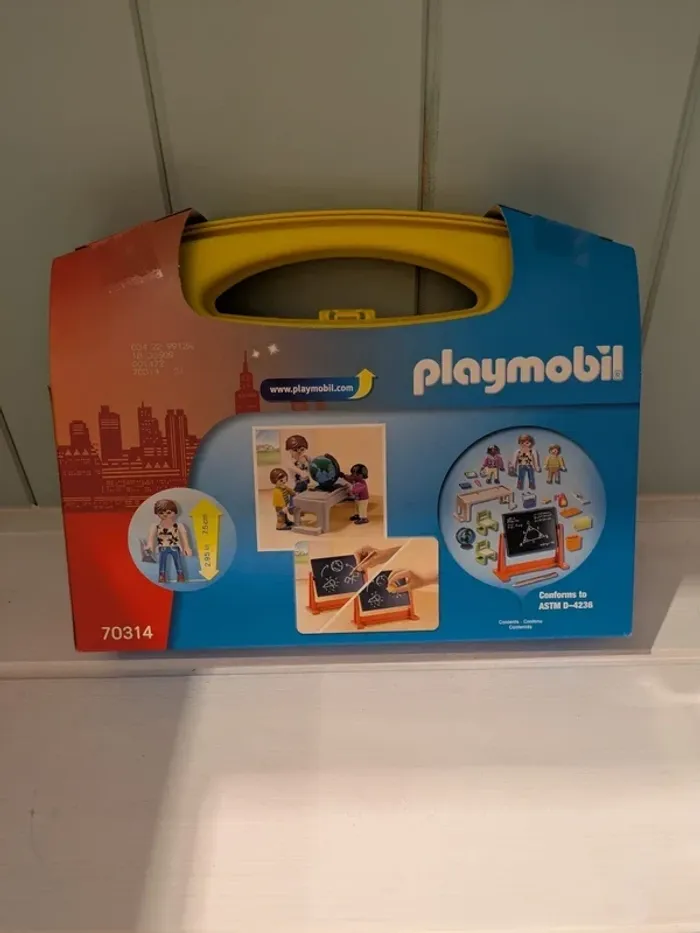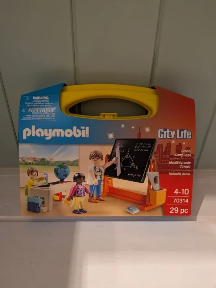 Cette boîte contient 29 pièces, dont : trois figurines Playmobil, un tableau effaçable, et des fournitures scolaires (crayon, livre, équerre, etc.). Pratique, il pourra l'emporter partout avec lui.