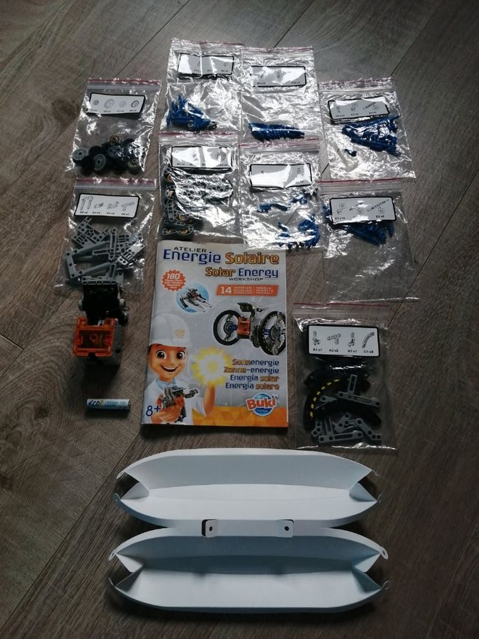 o Contient de nombreuses pièces permettant de construire 14 véhicules qui avancent grâce à l'énergie solaire (sans pile)