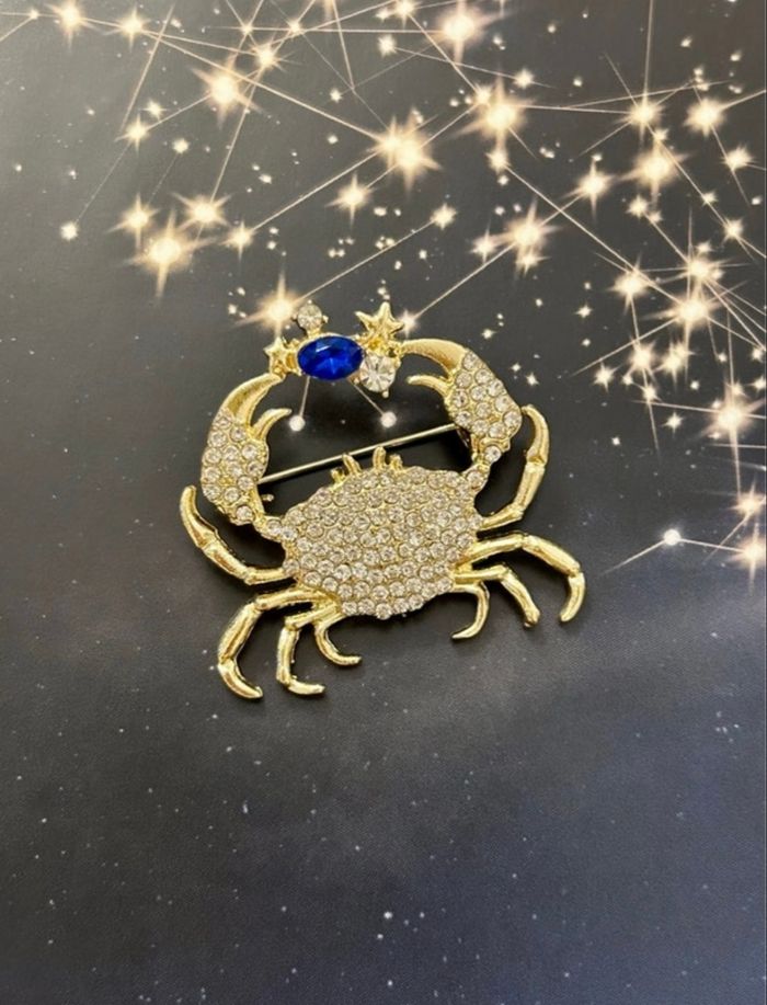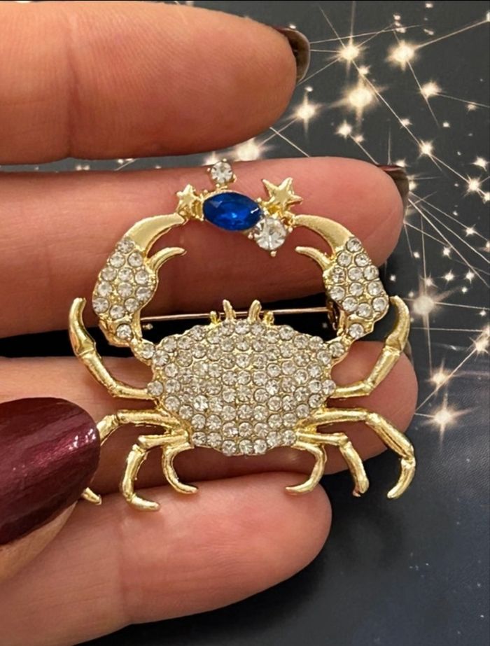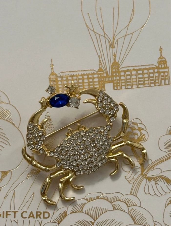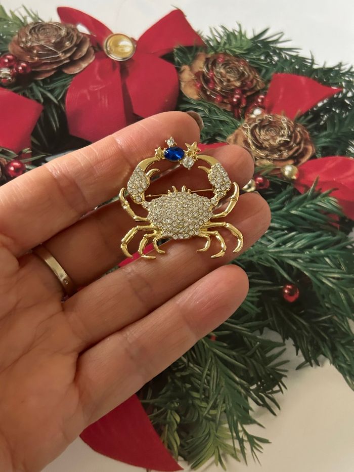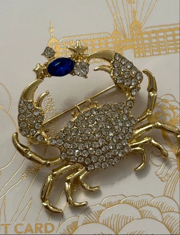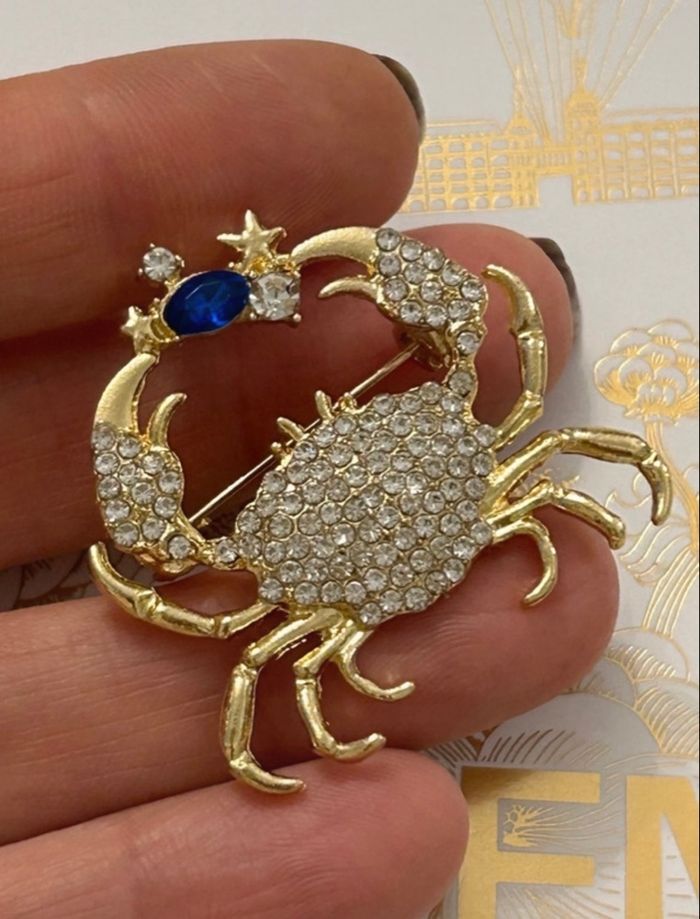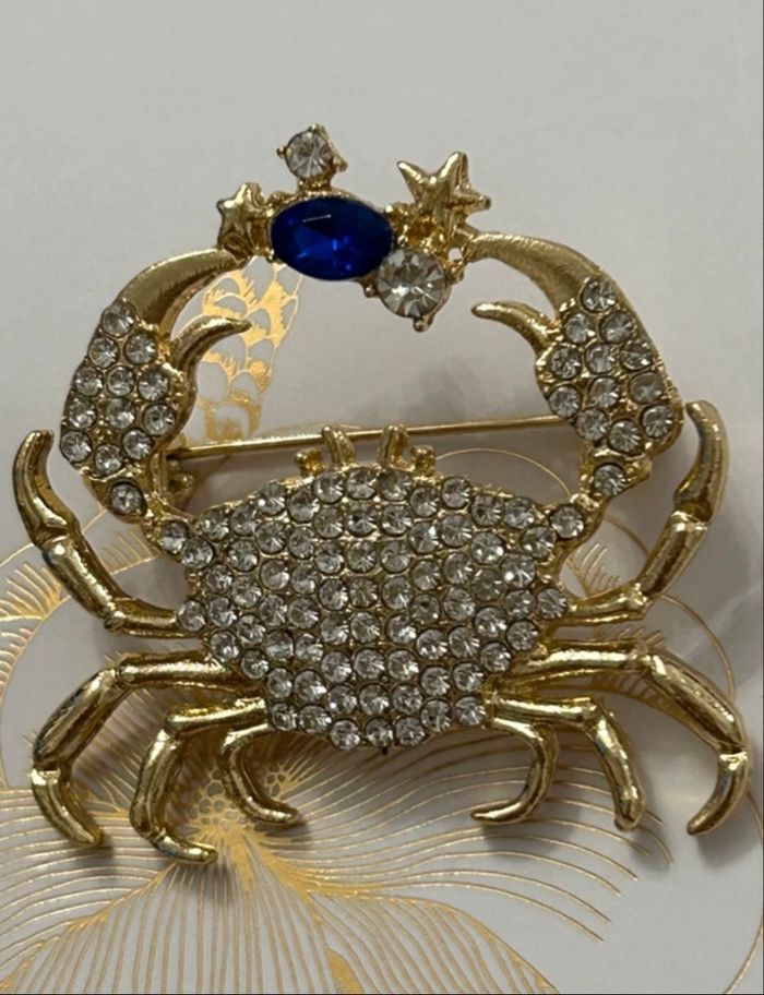Je mets en vente une magnifique broche représentative d'un crabe, idéale pour les amateurs de bijoux uniques. Cette broche en alliage de zinc recouvert de métal doré est ornée de ravissants petits zirconiums discrètement scintillants .Ses dimensions sont de 3,4 cm X 3,5 cm, ce qui en fait un accessoire délicat qui attirera tous les regards.