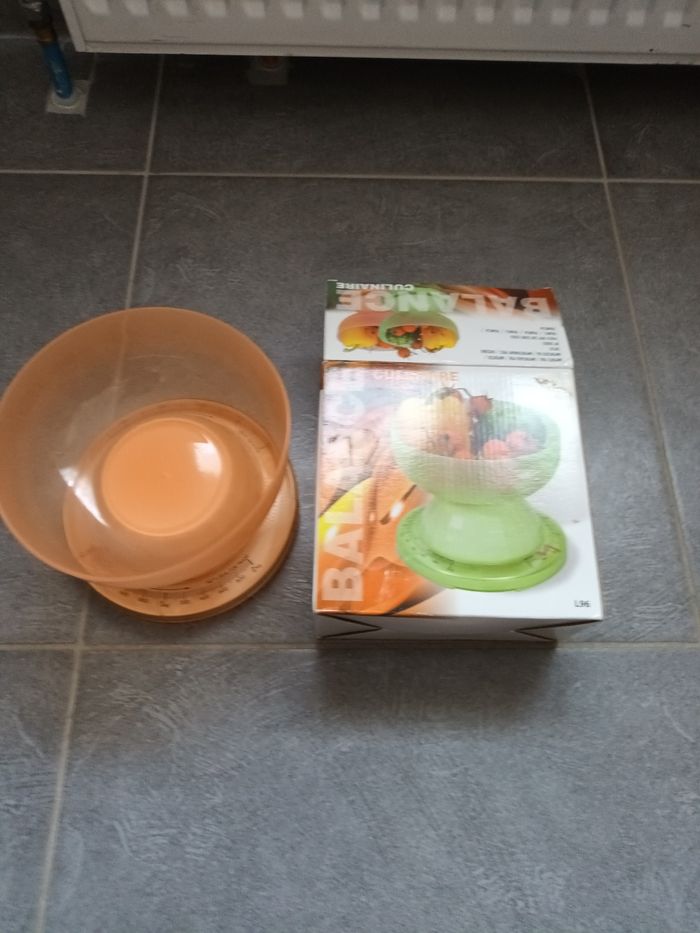 Balance culinaire en plastique orange. Pesage de 0 à 2 kg. Précision : 0-1000g (20g), 1000-2000g (40g). Le socle a été cassé et recollé. Ça n'empêche pas son utilisation. Idéal pour étudiant. A beaucoup servi. Peut encore servir et dépanner une personne. Vendue dans sa boîte d'origine.