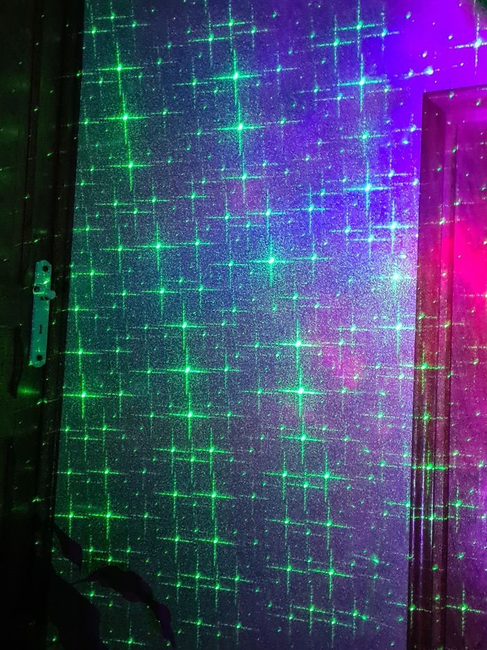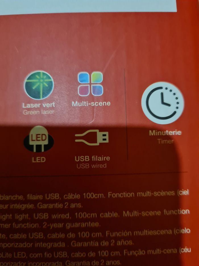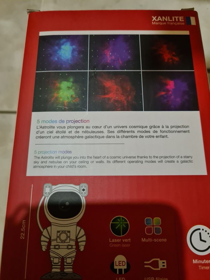 Neuf, jamais utilisée, seulement pour photos et donner du rendu. Hauteur 22,5 par 10cm environ Tête orientale à 360. Fonction multi scènes 5 modes de projection multi couleurs Câble USB