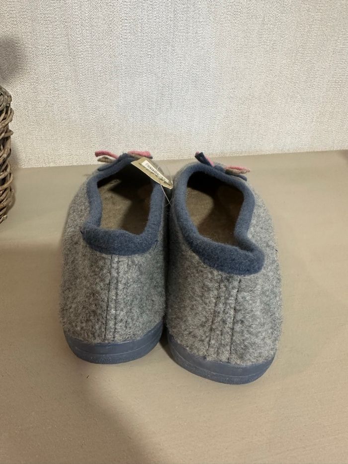 Cette pantoufle Femme est en textile molletonné (fresa), avec un liseré bleu sur le pourtour, assorti à la semelle.