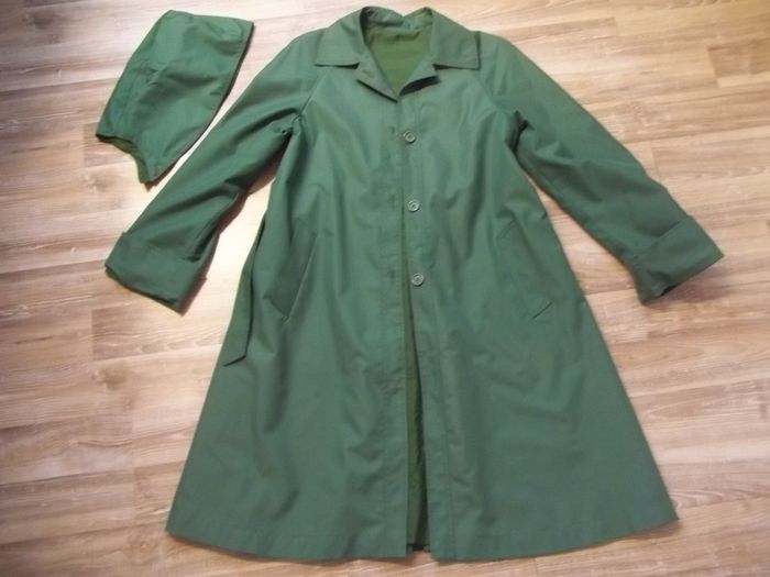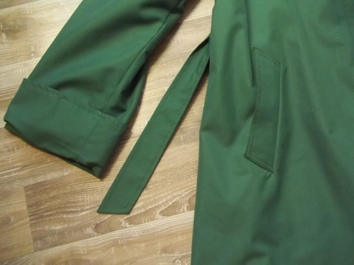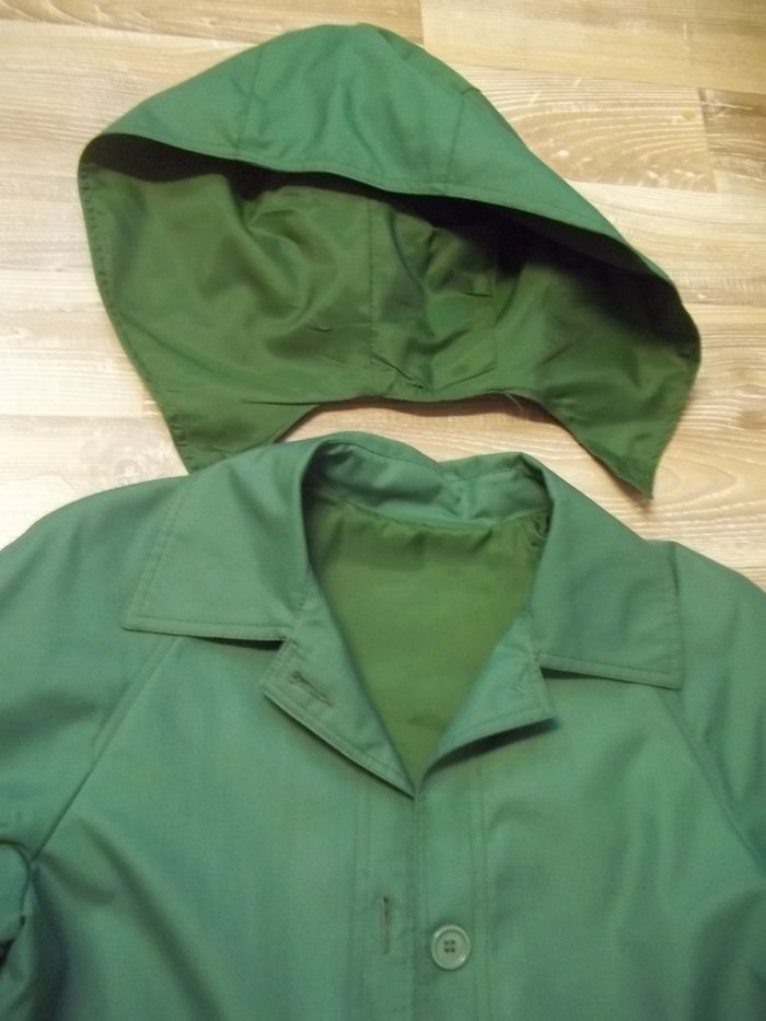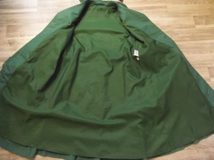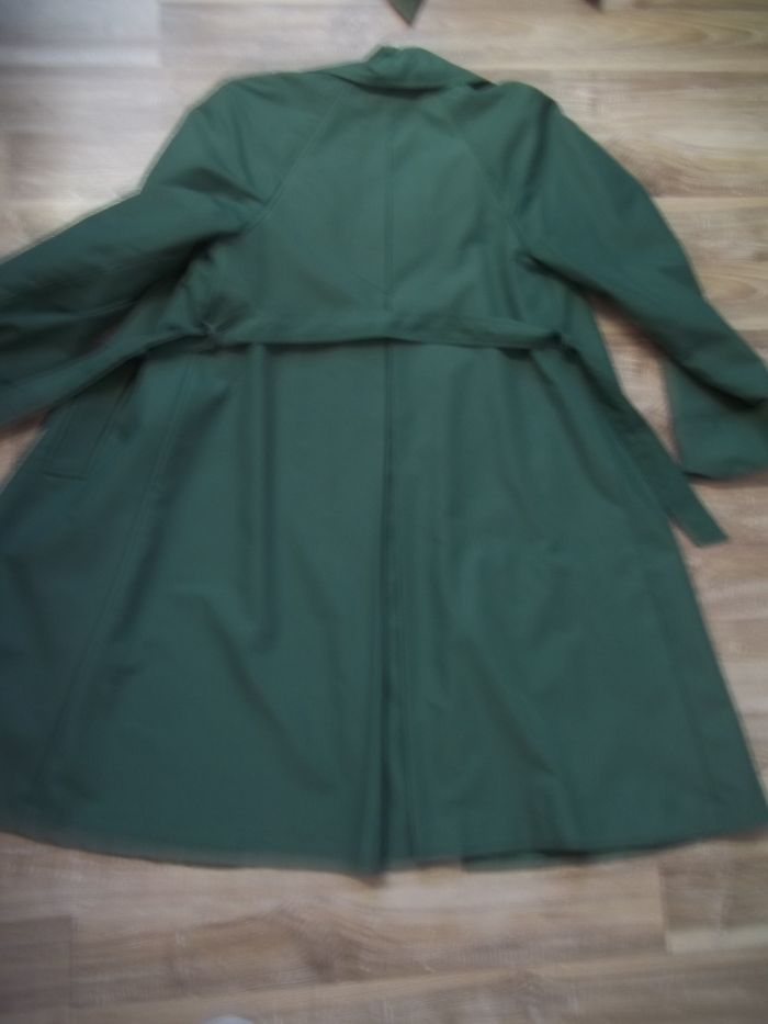 Manteau en toile 100 % coton vert foncé/sapin doublé (à priori polyester) ton sur ton. Capuche amovible (3 boutons sous col, pas ceux d'origine). Emmanchures américaines. Fermé par 4 boutons et ceinture. 2 poches non fermées extérieur. "Soufflet" sur presque toute la longueur milieu dos. Taille effacée, estimée à du 40 (ou petit 42 ?). Longueur 100 cm, manches env 63 cm (revers aux poignets non cousus), largeur épaules env 39 cm, aisselles 48 cm, poignets 18 cm.