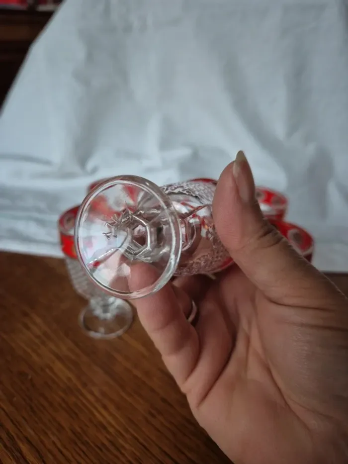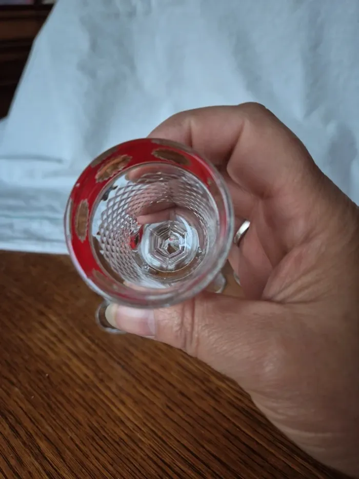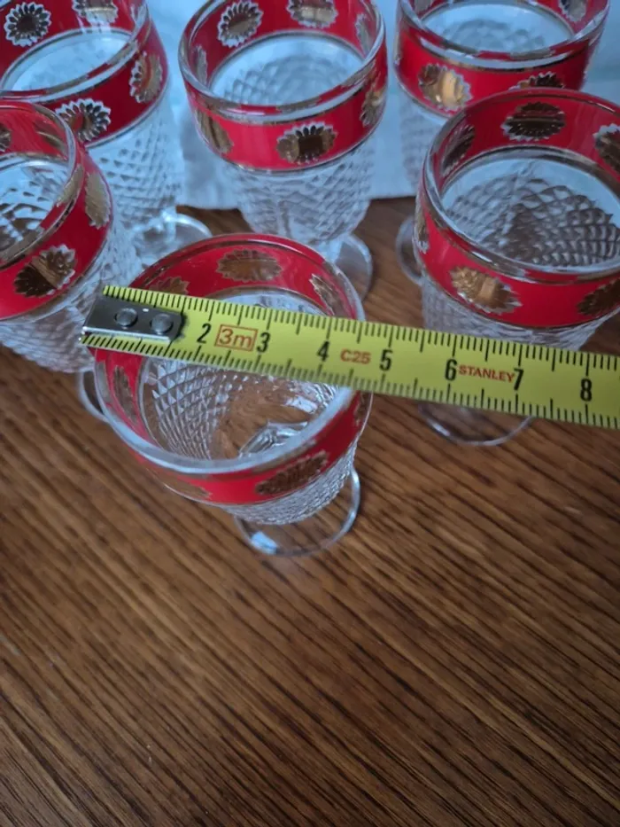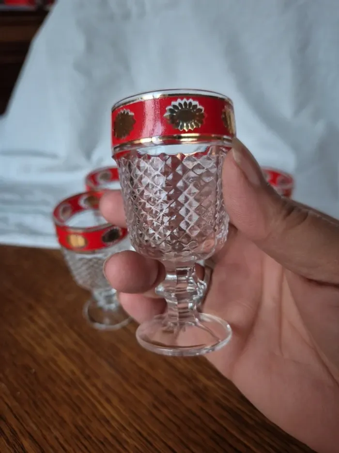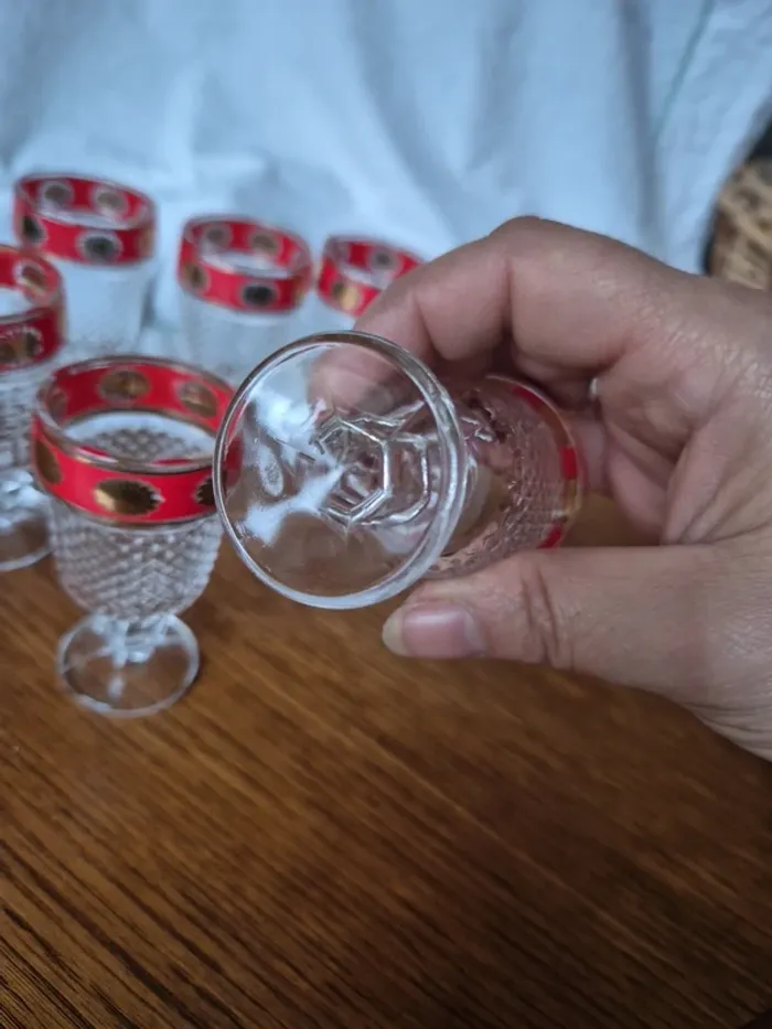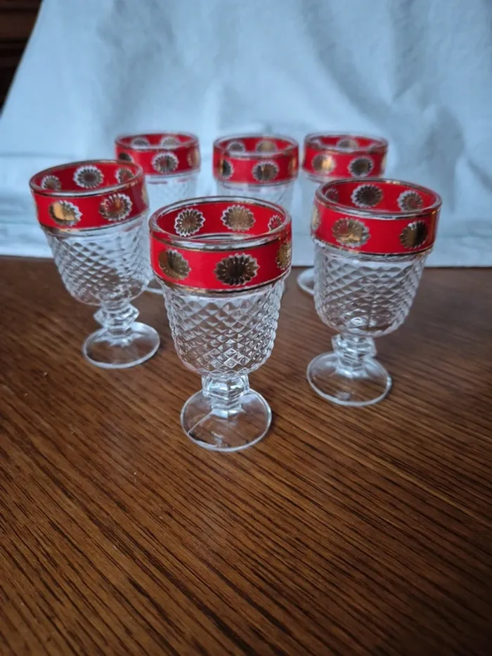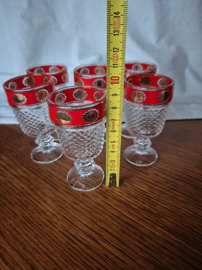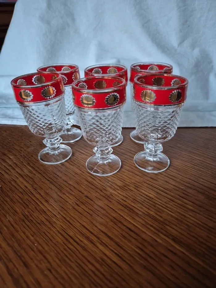 ⬇️mes autres annonces d'article de maison, décoration👉 #cg89déco lot de 6 verres à pieds pour la liqueur ou digestif. Ils sont magnifiques avec leur liseré rouge et imprimé doré. Produit en Italie bon état #verre #vintage #vaisselle #cadeau #decoration