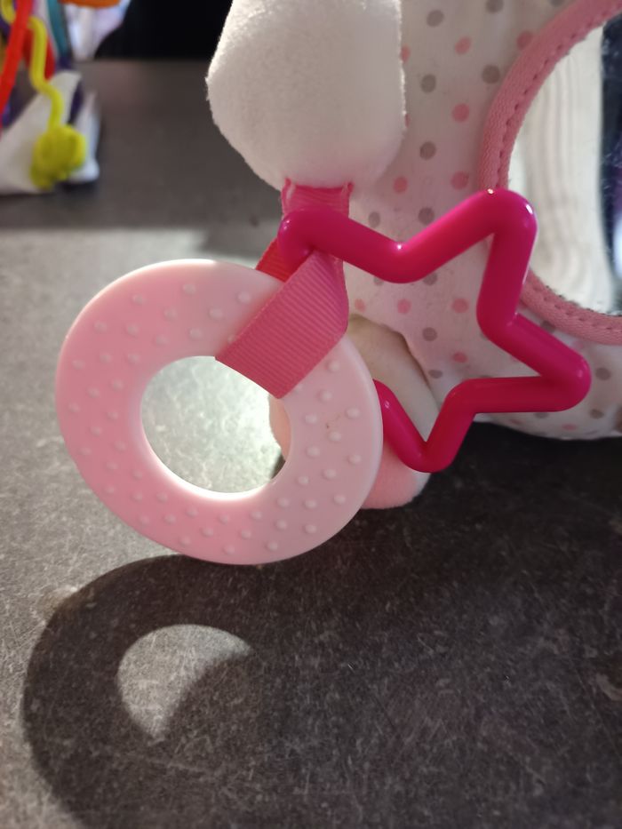 La peluche licorne d'activités Fun House Plush est idéale pour éveiller les enfants dès la naissance. Elle propose plusieurs activités telles que du papier bruissant, un miroir, un pouêt, un hochet et des languettes. Agréable au toucher, elle permettra aux enfants de s'éveiller à leur rythme. Très bon état, juste le miroir qui est griffé (voir photo)