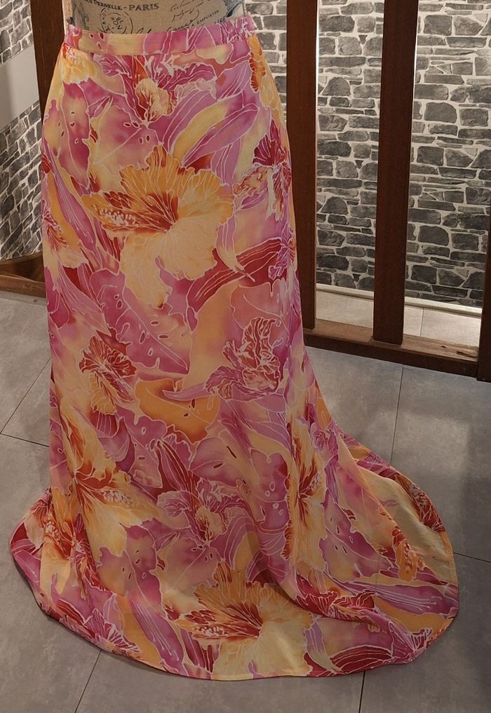 Jupe doublée taille 46 longueur 90 cm élastiquée aux hanches, fermée au dos par zip, fente d'aisance. Débardeur transparent taille 48. Chemise longue taille 46 boutonnée transparente, manches courtes fentes sur les côtés, hauteur 84 cm. Ensemble neuf jamais porté en 100 % viscose. Le débardeur n'est pas la même taille que la jupe et la chemise.