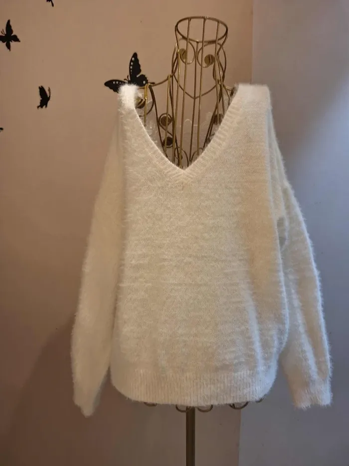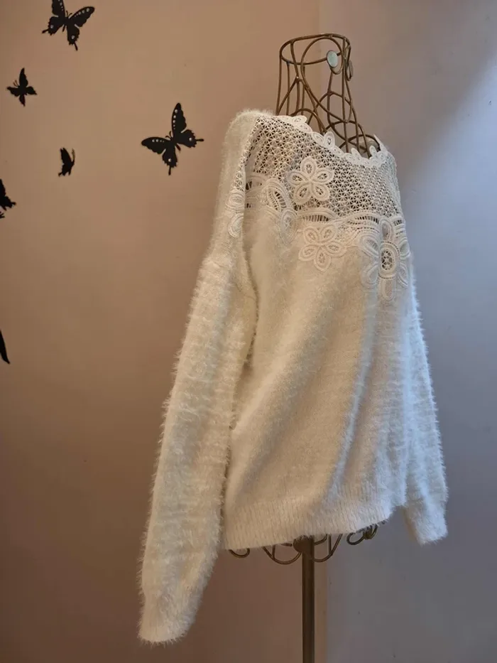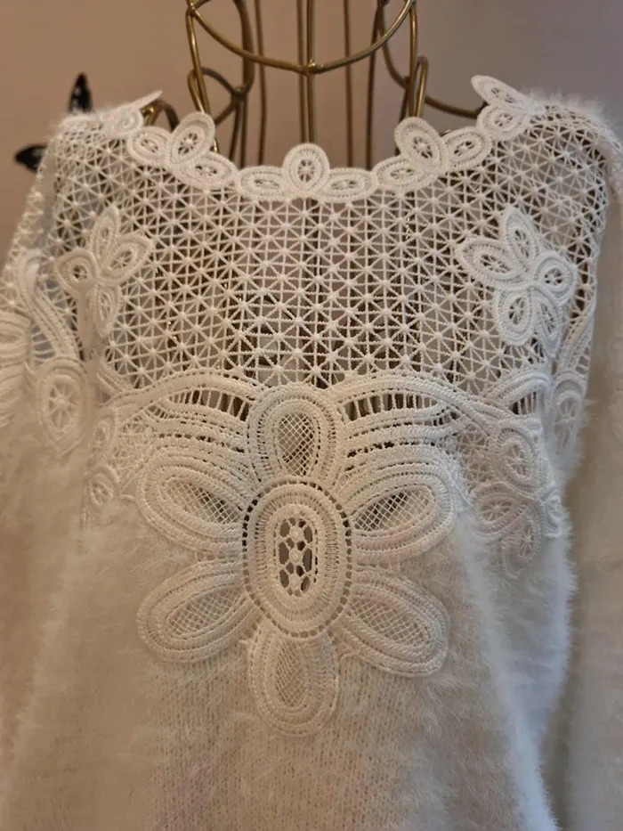 Pull blanc en mailles duveteuses blanches - décolleté en dentelle ajourée - longueur 53 cm - matière douce & extensible - taille unique idéale pour les tailles S & M ou 36 & 38 - état sans défaut ps : - je ne fais pas de photo portée #pullblanc #pullblancdentelle #pulldentelle