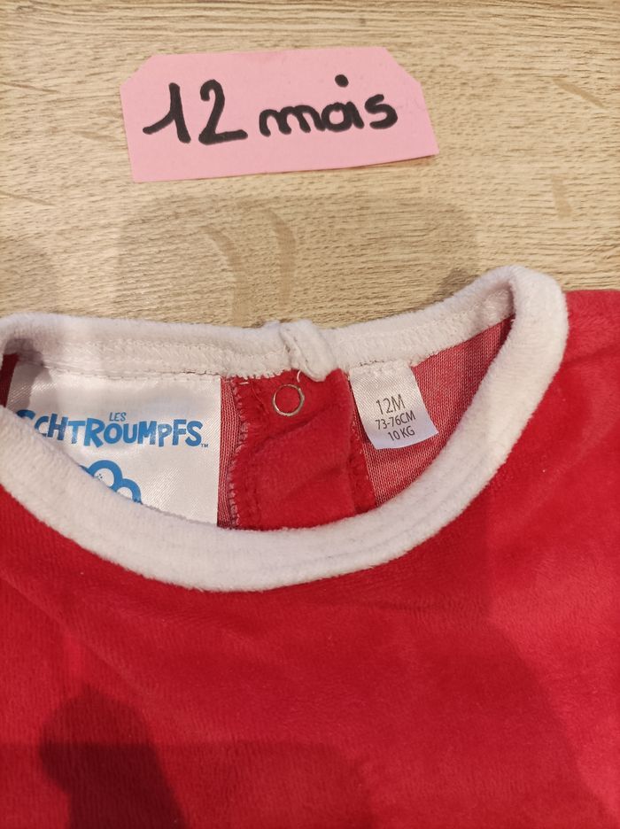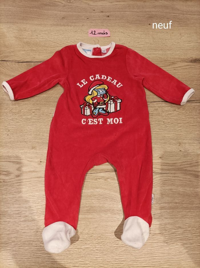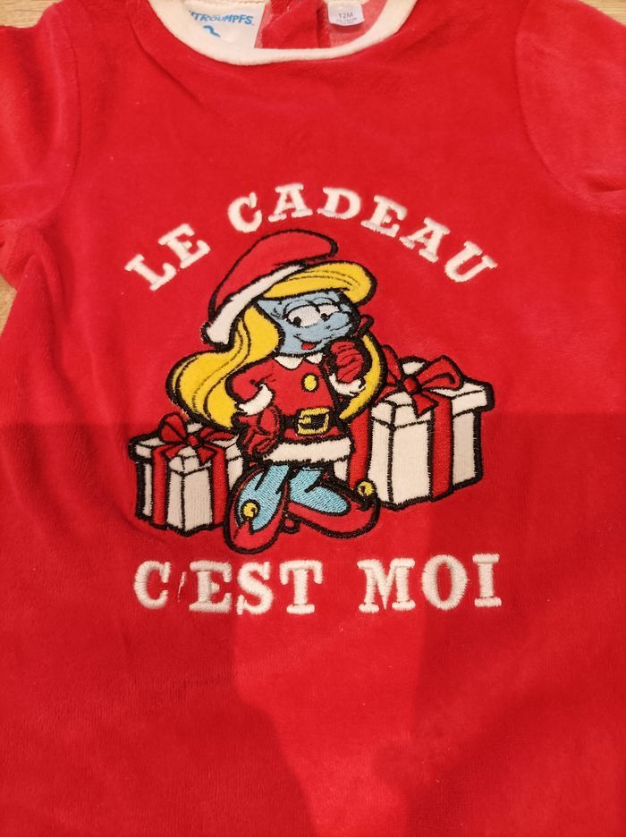 Pyjama schtroumpfs en velours Hiver Noël 12 mois Peu porté, très bon état, juste 2 petites traces légères sous les pieds voir photo Envoi mondial relay