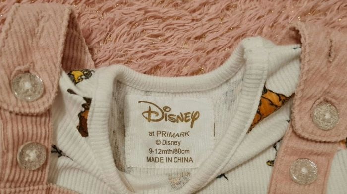 Jolie robe salopette en velours côtelé rose. Accompagnée d'un haut manche longue blanc avec motifs Bambi et Panpan. Taille 9-12 mois mais taille plutôt 12 mois.