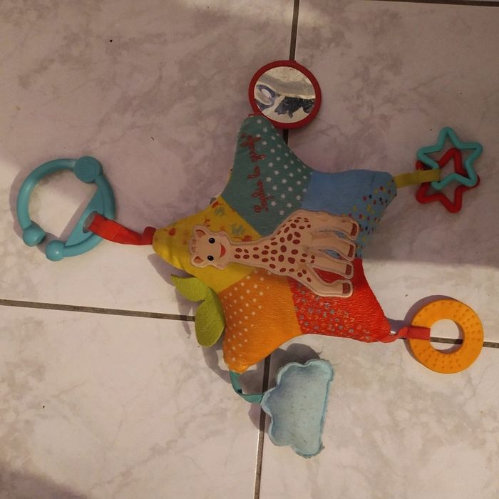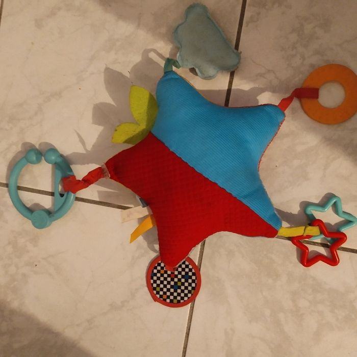 Une étoile avec plus de 6 activités pour éveiller les sens de bébé : des couleurs vives, un pouet, du papier froissé, des textures variées (velours côtelé, micro-velours, feutrine…), un anneau de dentition à mordiller, des grelots, un miroir… Pratique, un crochet permet de suspendre l’étoile à de nombreux supports. le nuage a quelques bouloches mais ne gêne en rien l'utilisation le miroir est un peu décoloré voir photo