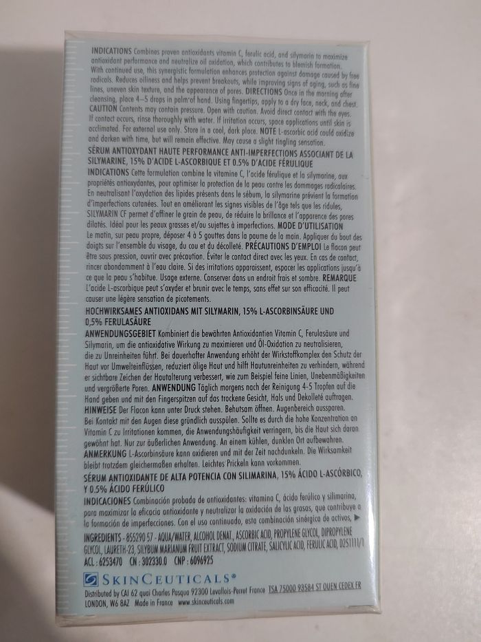 Silymarin CF est un sérum antioxydant à la vitamine C pure qui délivre une double-action anti-âge et anti-imperfections : il lisse les rides et ridules, affine le grain de peau, réduit la brillance et l’apparence des pores dilatés, et prévient la formation d’imperfections cutanées. Convient particulièrement aux peaux grasses ou à imperfections