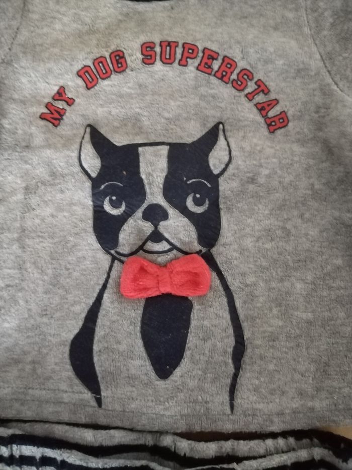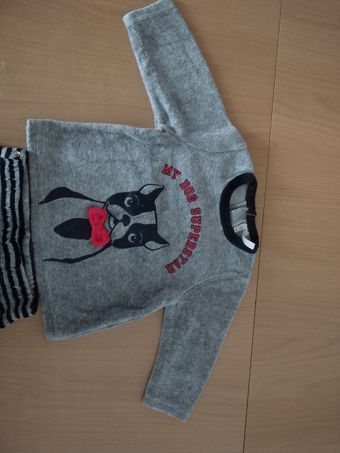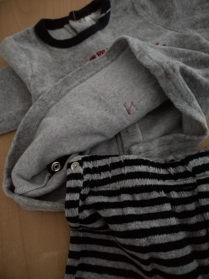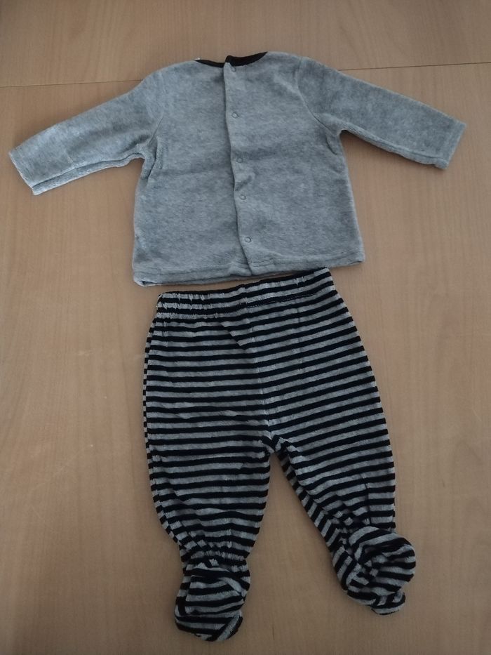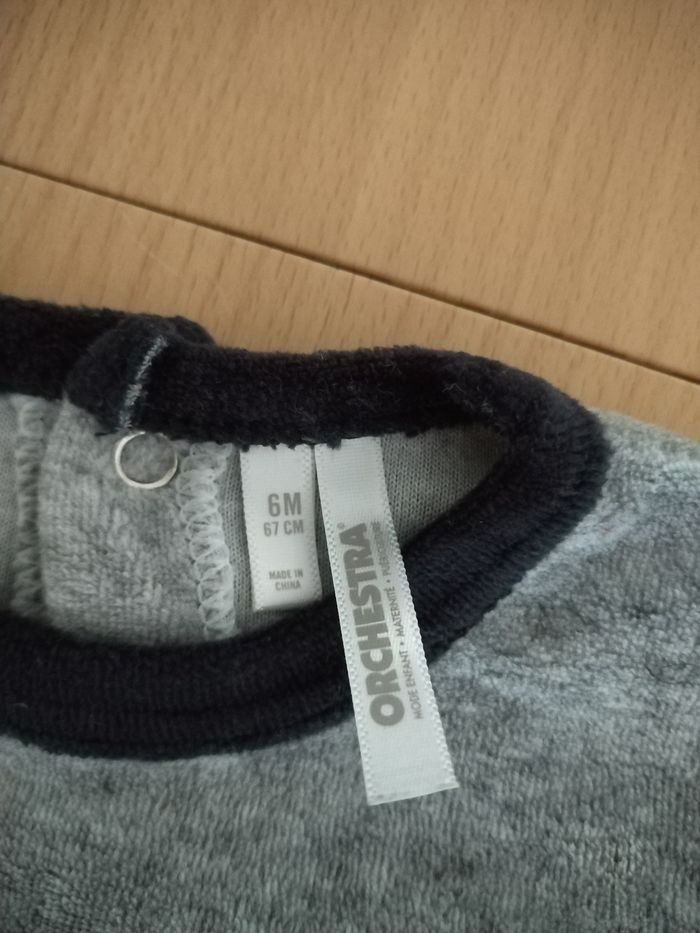 Pyjama deux pièces en velours bébé garçon Orchestra. Le haut et le bas peuvent s'attacher ensemble par des boutons pression. Peu porté, parfait état. Taille 6 mois