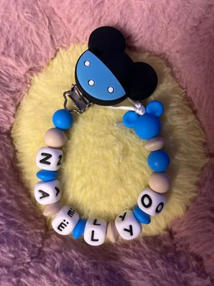 Attache tétine personnalisé en silicone ou en bois au souhait de l’acheteur . Personnalisable au choix de l’acheteur que ce soit la couleur comme le prénom ou le thème . Le fil est doublé pour plus de sécurité tout le long de l’attache tétine. N’hésitez pas à me demander et regarder mon dressing. Une photo vous sera envoyée avant l’expédition pour vous ayez un aperçu du rendu. Tous les produits sont réalisés avec du materiel spécial conçu aux bébés , enfants.