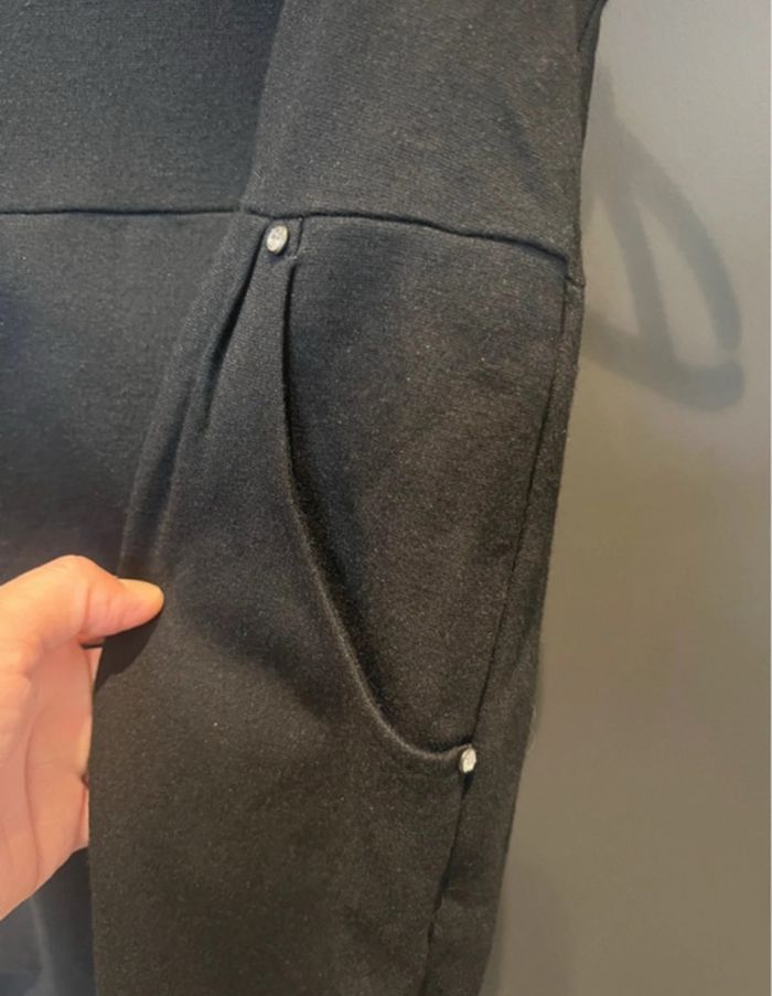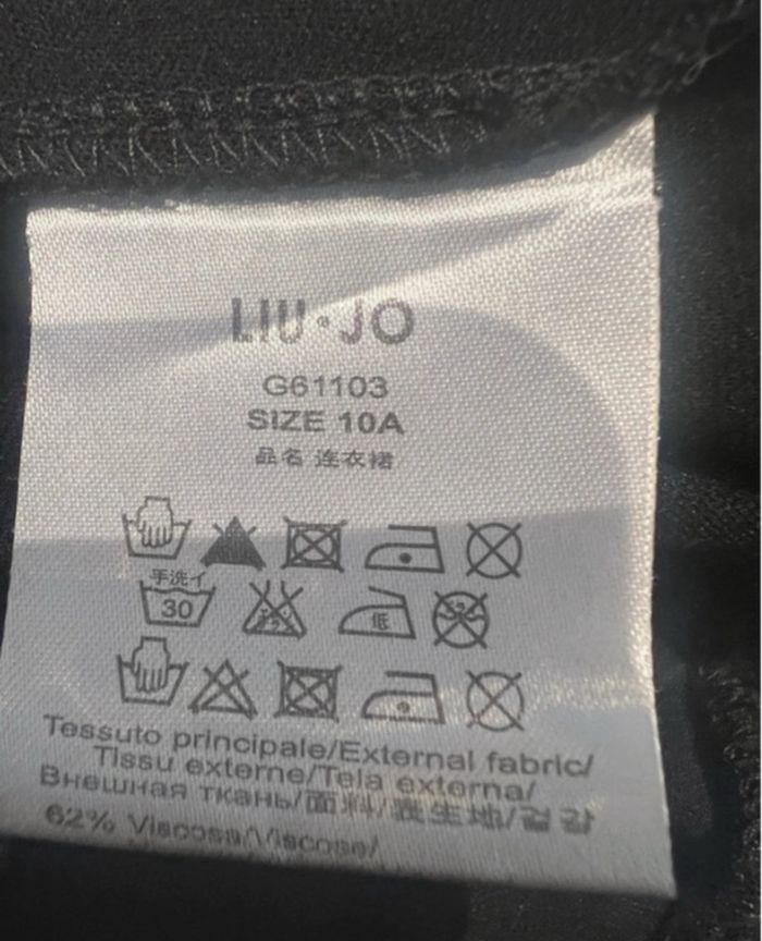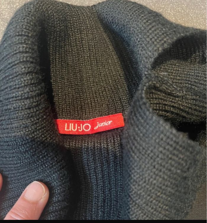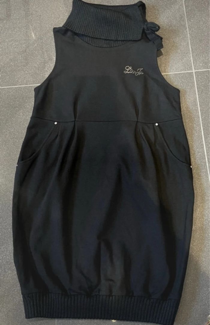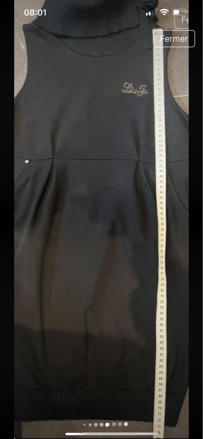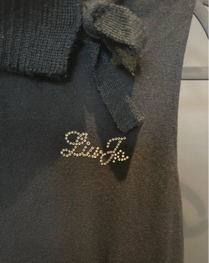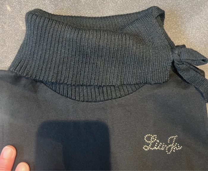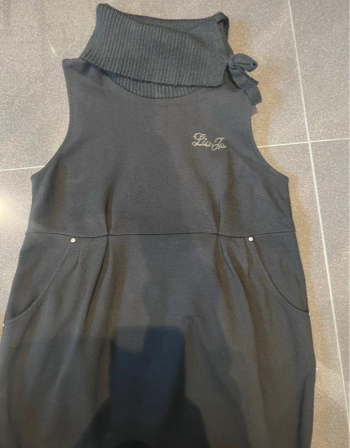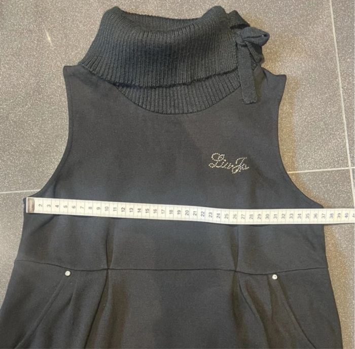 Superbe robe noire sans manches Liu Jo Junior, taille 10A, alliant chic et originalité. Elle se distingue par son col châle montant en maille côtelée qui se noue délicatement sur le côté, et le logo "Liu Jo" scintillant en strass sur la poitrine. Des petits strass ornent également les coins de ses deux poches latérales discrètes. Sa coupe moderne est sublimée par un bas de robe en bord-côte tricoté créant un effet boule très tendance. Confortable et souple grâce à sa composition majoritaire en viscose, cette robe sera parfaite pour toutes les occasions spéciales