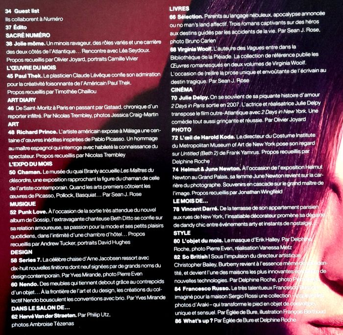 30x23cm 215 pages + english text spécial Léa Seydoux 6 pages, Beth Ditto 6 pages, Virginia Woolf 2 pages, Helmut Newton 4 pages, mode accessoire style dess me up, beauté parfums, mode chrysalide, mode fantasy, mode je t'aime moi non plus, mode dévoilée, mode oiseaux de paradis, mode in love, mode l'amante, Maria Grazia chiuri pierpaolo piccioli 6 pages, damien hirst 6 pages, architecture maison fobe ..