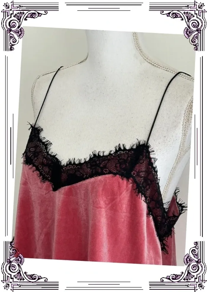 Superbe débardeur Undiz en taille 40, en velours ras rose foncé avec un magnifique décolleté souligné de dentelle noire.