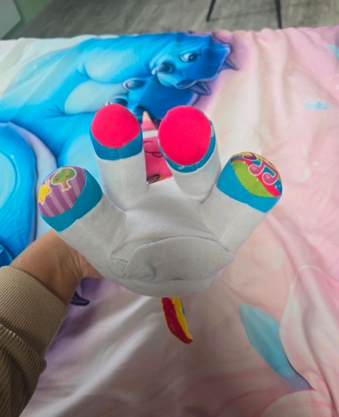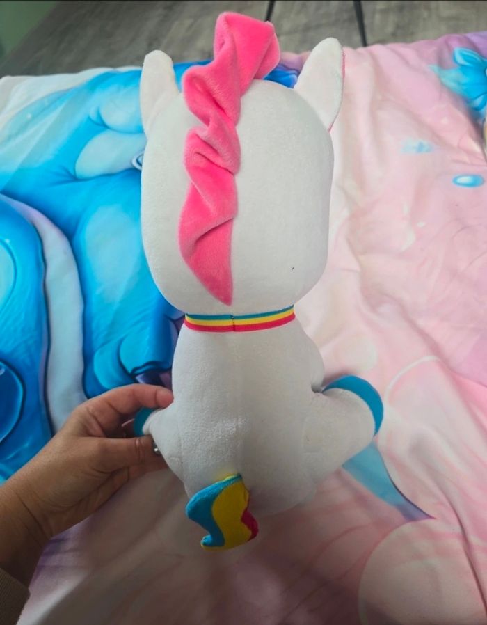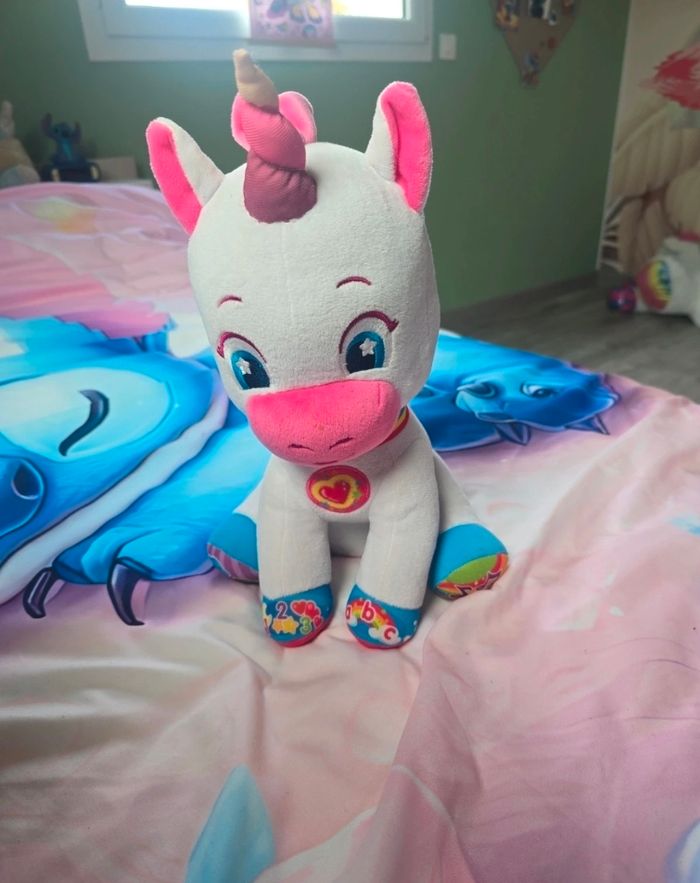 Cette licorne est dotée de cinq boutons sur chacun des membres pour découvrir, en comptines et en chansons, les formes et les couleurs, les premiers chiffres, les premières lettres et nos amis les animaux.