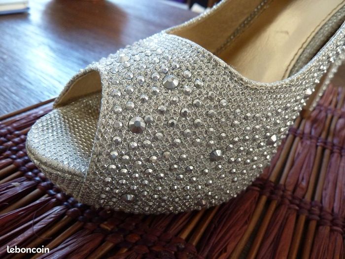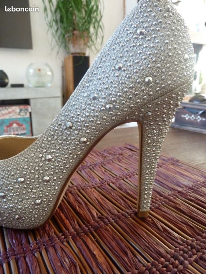 Ces escarpins argentés pailletés argentés mettront, sans conteste, vos pieds en valeur! Pointure 39. Talons 11cm. Comme neuf !