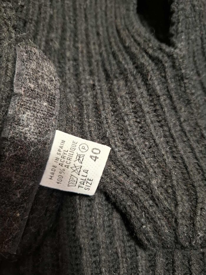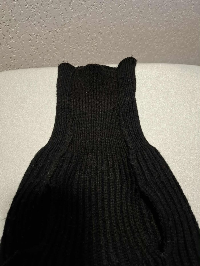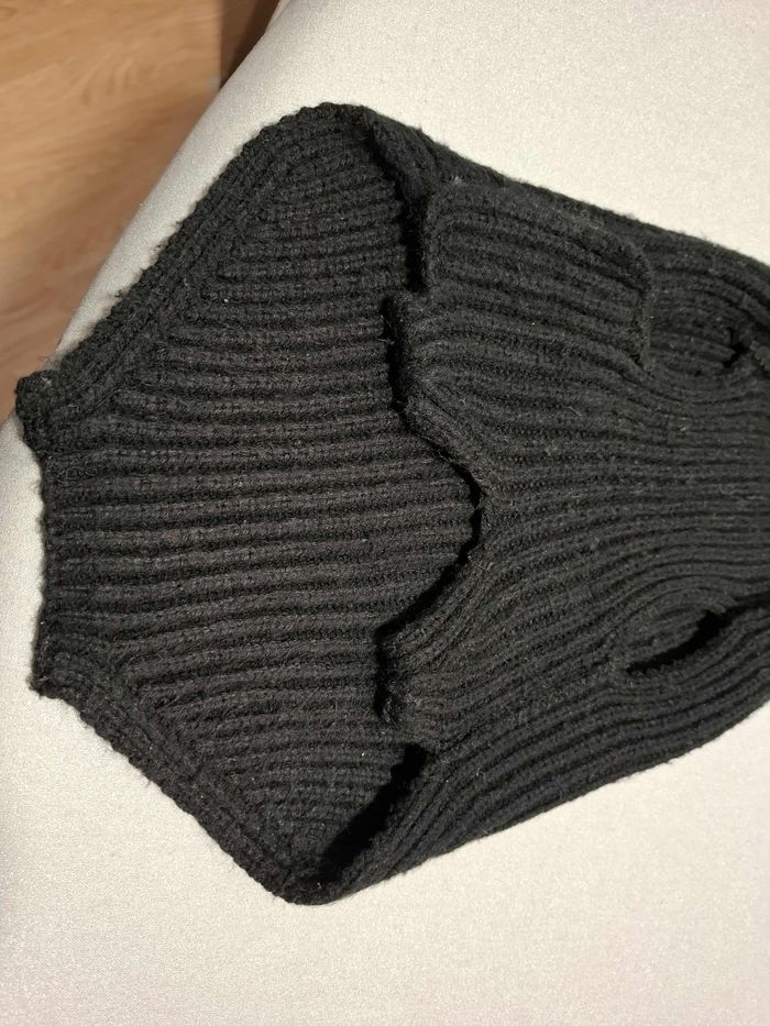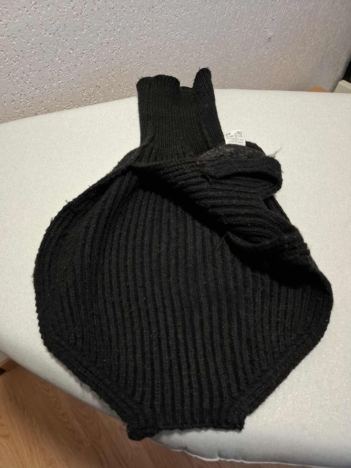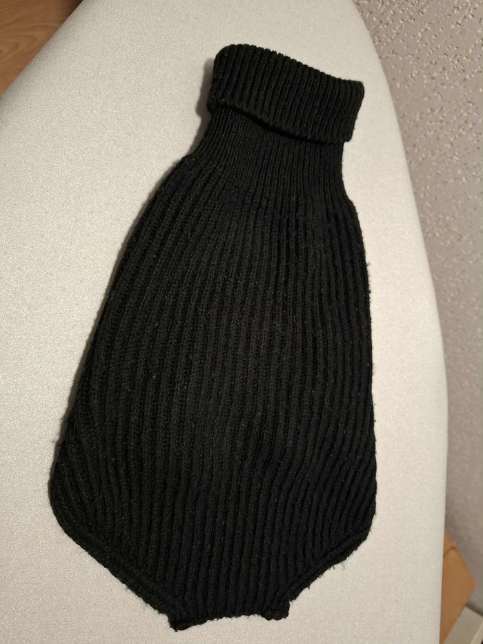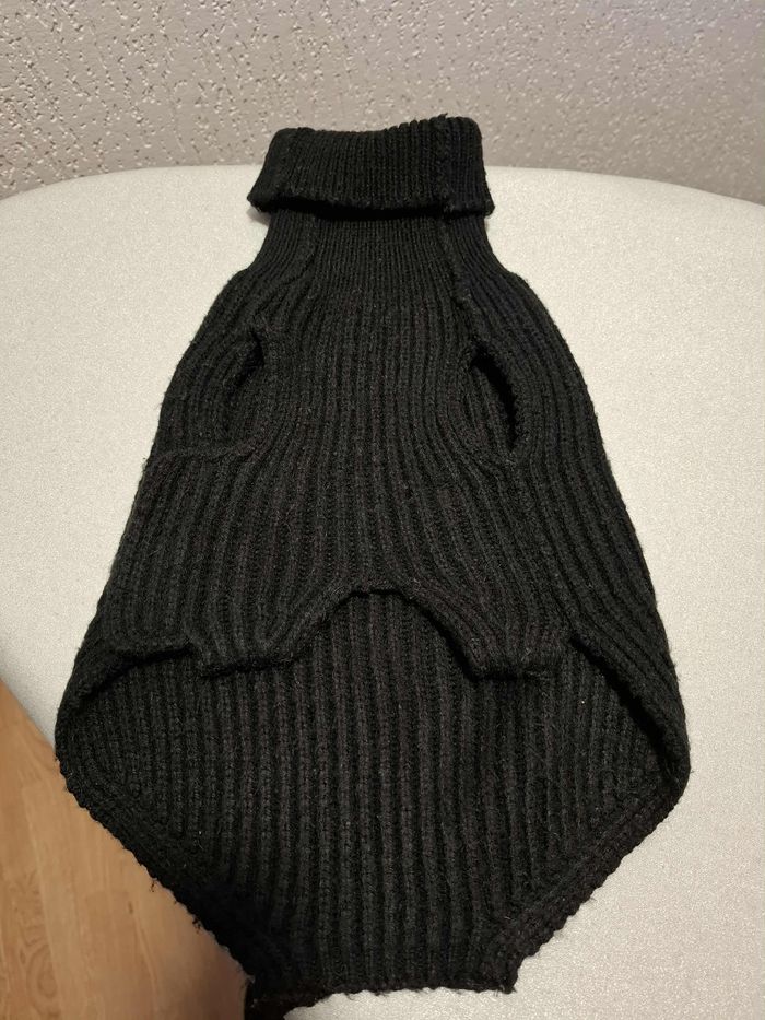 Pull pour petit chien, en taille 40, couleur noir uni, en maille tricot extensible 100 % acrylique bien chaude et épaisse, lavable en machine à 30°, col montant bien couvrant, fermeture ventrale à scratch, en bon état (quelques bouloches mais rien de grave) et lavé.