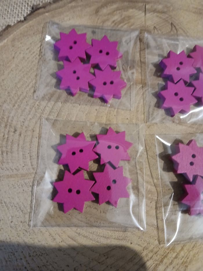 Lot de 4 sachets de boutons en bois étoiles rose. D'autres tissus ruban boutons perles et accessoires biais ect... de dispo ds mon dressing n'hésitez pas à jeter un coup d'œil ou à me demander.