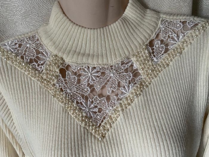 Pull vintage crème dentelle perles taille 3 maille chic - photo numéro 2