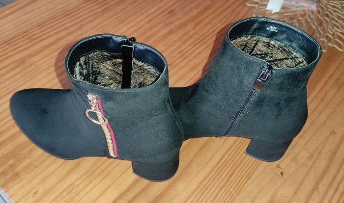 Confortable et facile à mettre grâce à l' ouverture sur le côté (fermeture éclair) Détails sur l' autre côté fausse fermeture dorée Talon large Intérieur doux Bout effet brossé d' origine (Les mêmes en marron NEUVE)
