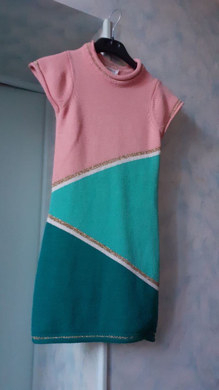 Vends une robe en maille, manches courtes 77 % acrylique, 19 % viscose, 1 % coton, couleur rose et vert, marque Orchestra, taille 8 ans. Longueur de l'épaule à la base : 66 cm.
