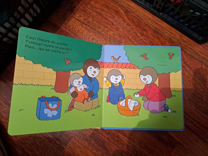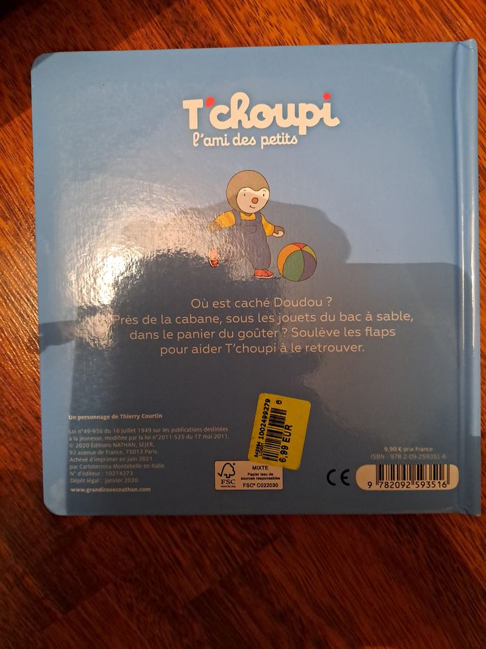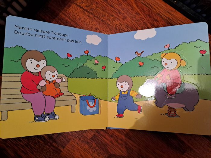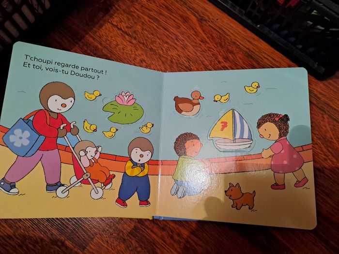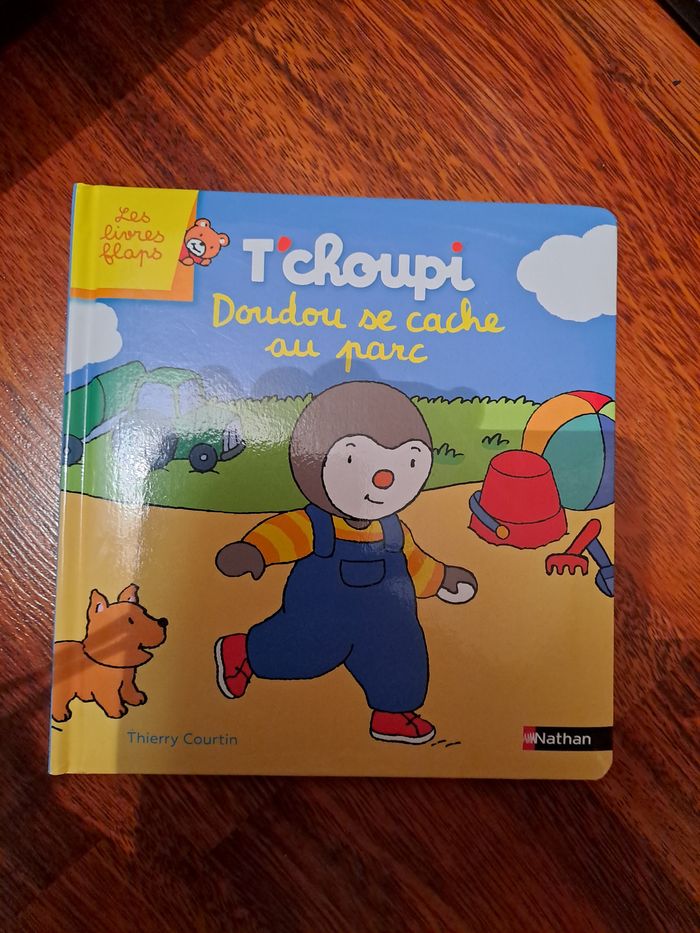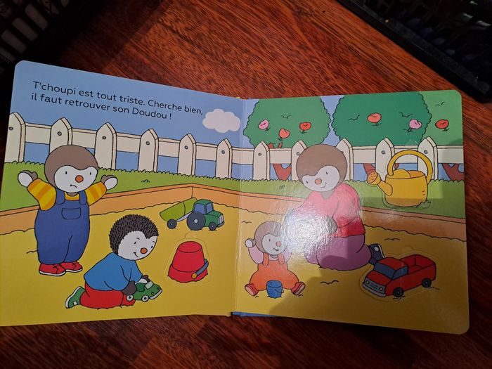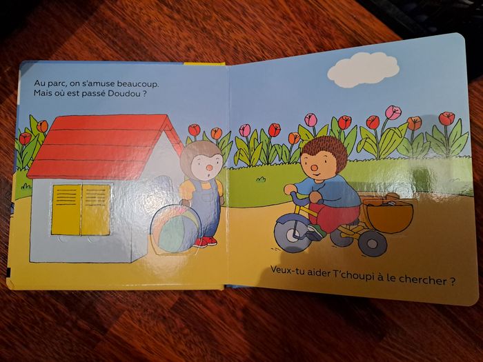 Livre en carton épais avec différents onglets à soulever afin d'aider Tchoupi à retrouver son doudou.