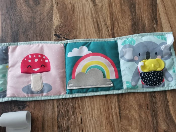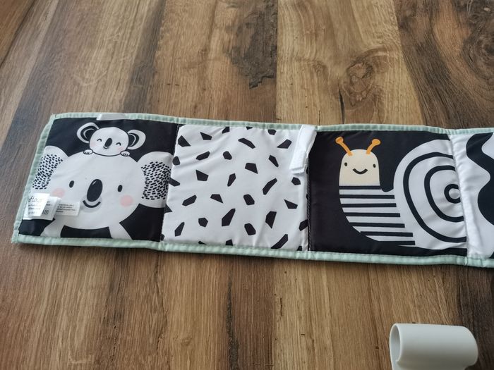 La page contrastée en noir et blanc convient très bien pour les enfants dès la naissance jusqu’à 3 mois. Les images plus colorées sont parfaites après 3 mois.