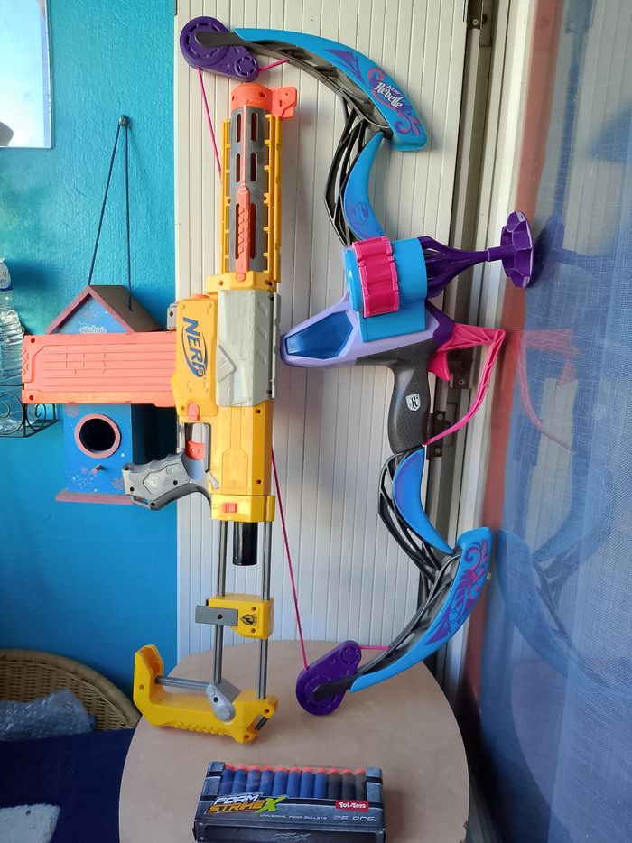 2 jeux Nerf + 1 carton de recharge Plus de flèche pour l'arc Hauteur 80 cm environ