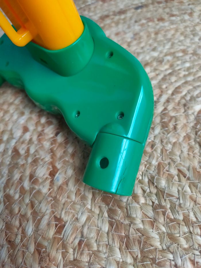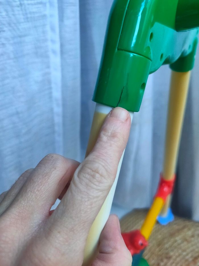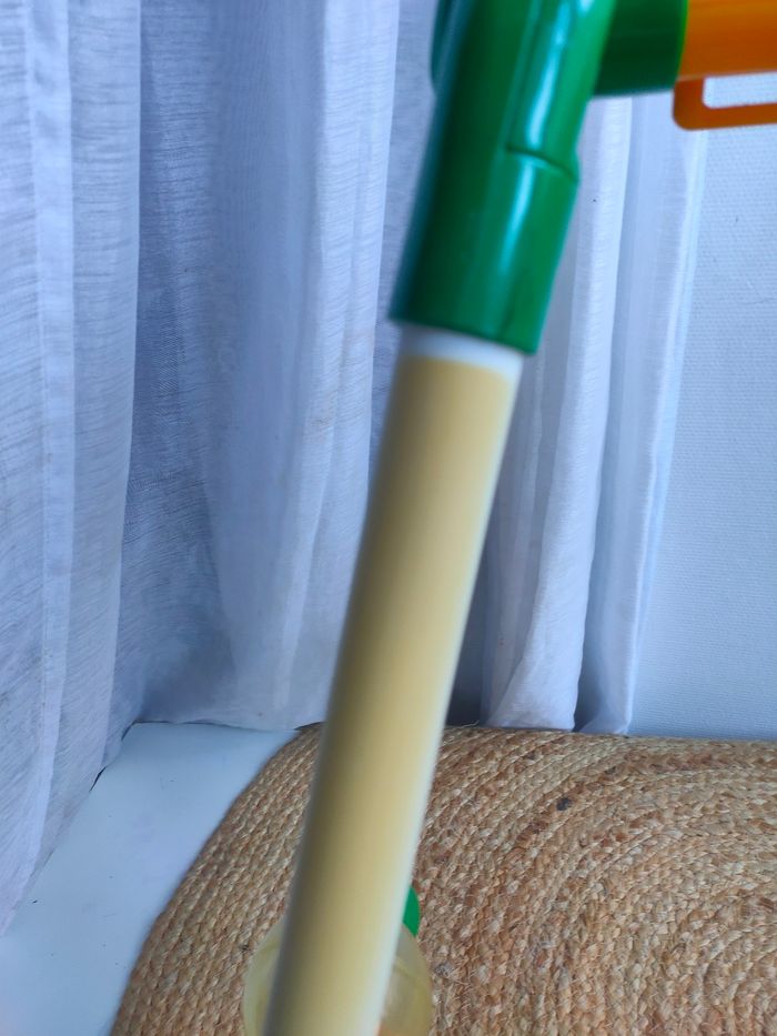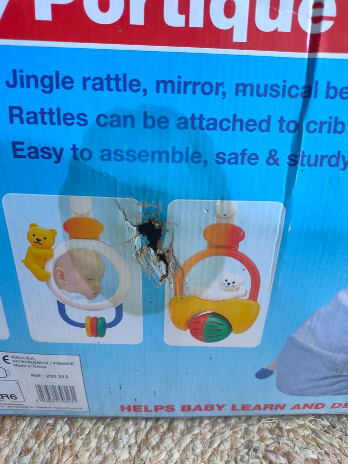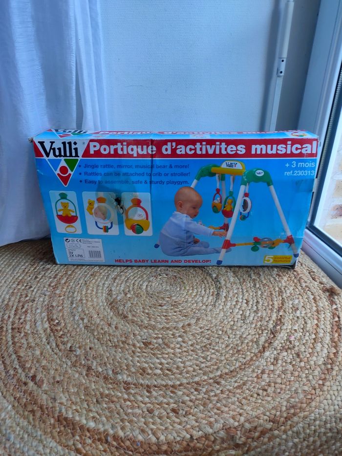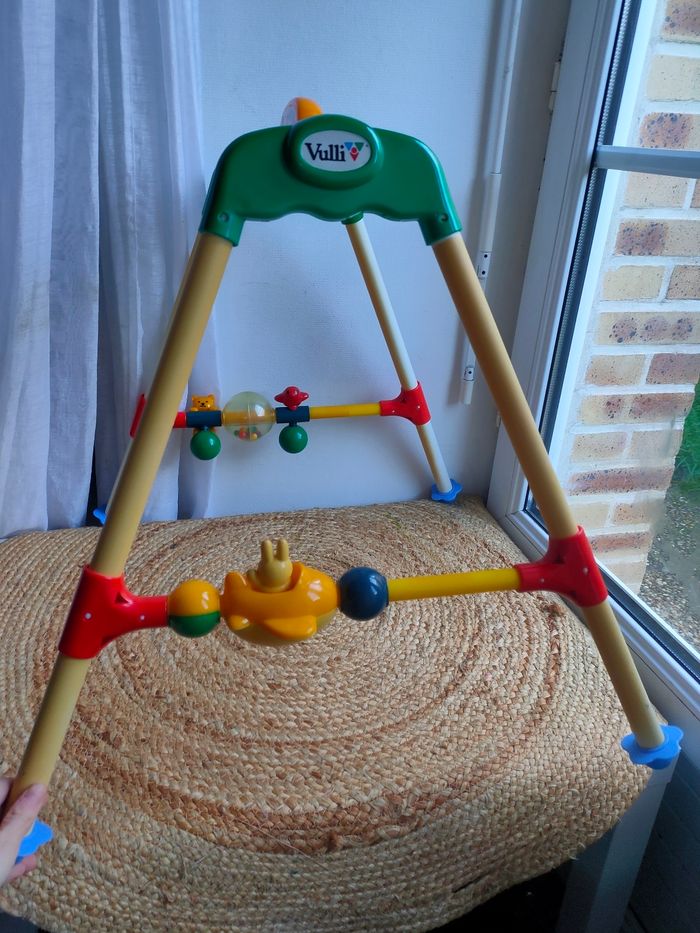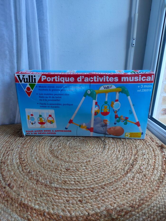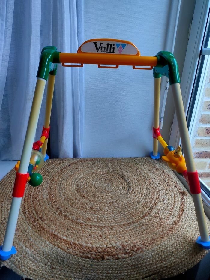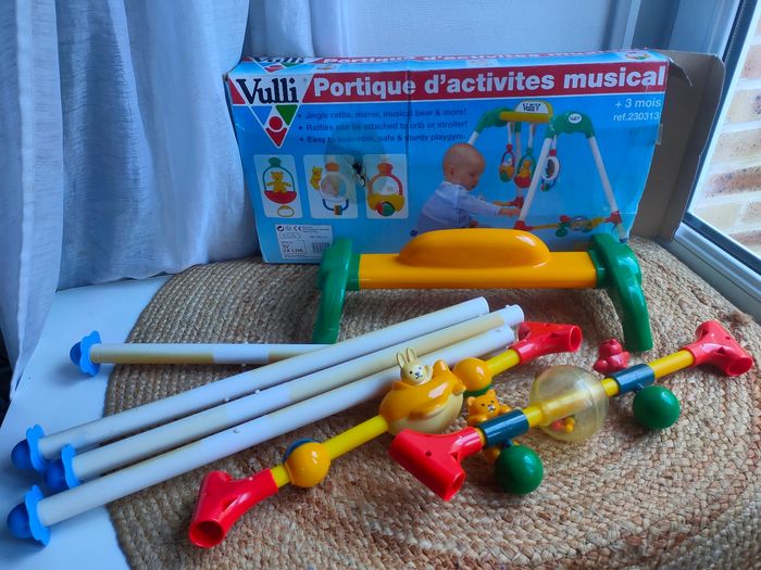 Portique d'activité marque Vulli modèle Vintage, il n'y a plus les jeux a suspendre, les parties blanches ont jaunit avec le temps, un empiècement est fissuré mais n'a aucun impact sur la solidité du portique, il est stable et solide. Il n'est pas tout jeune mais peut encore amusé les petits avec de nouveaux jeux a suspendre. Vendu dans son carton d'origine (qui est également abîmé)
