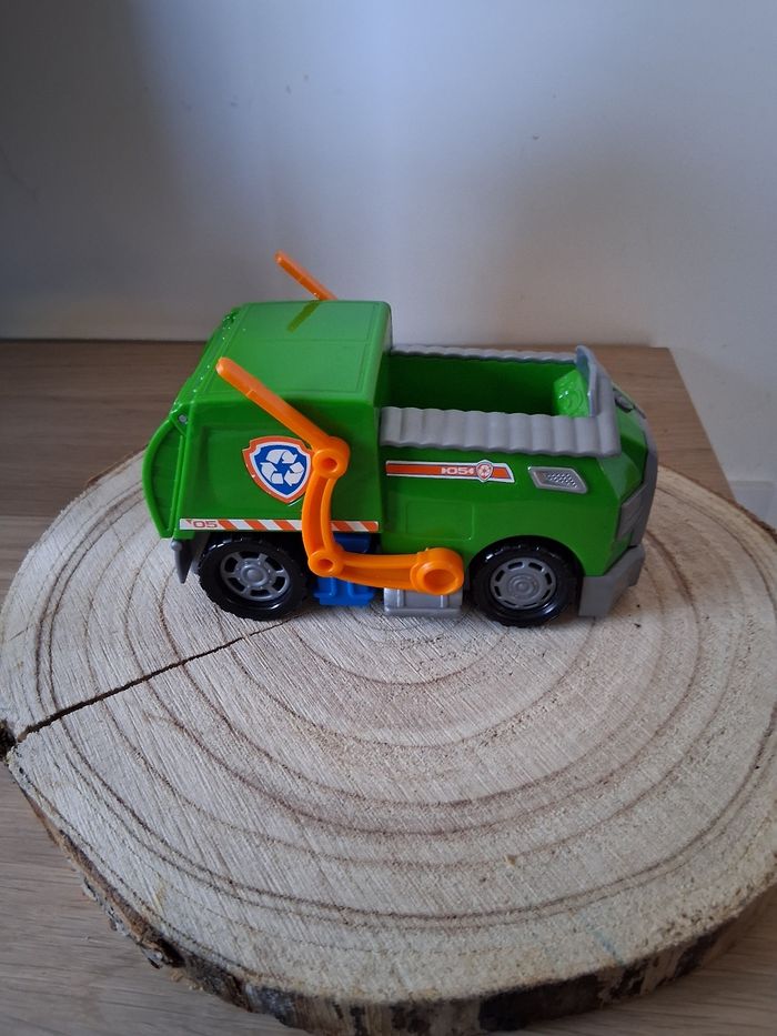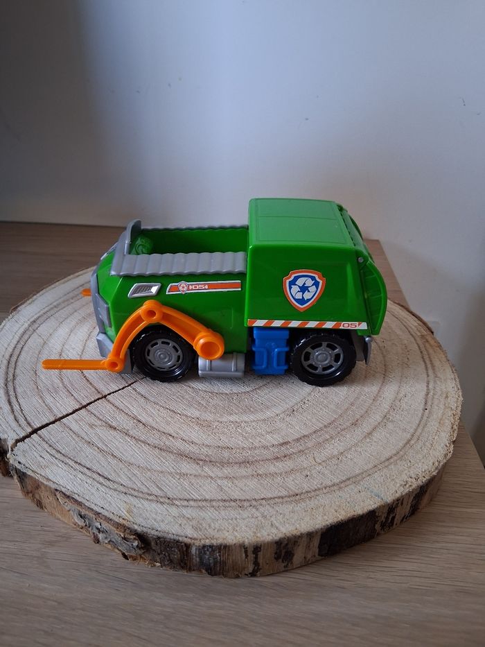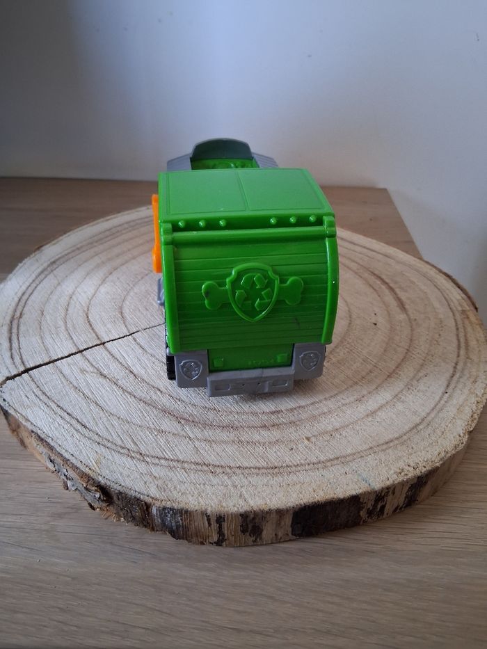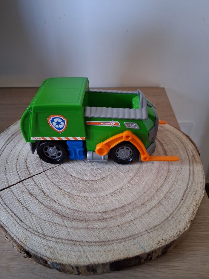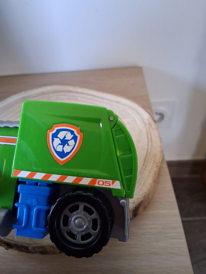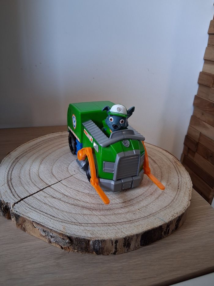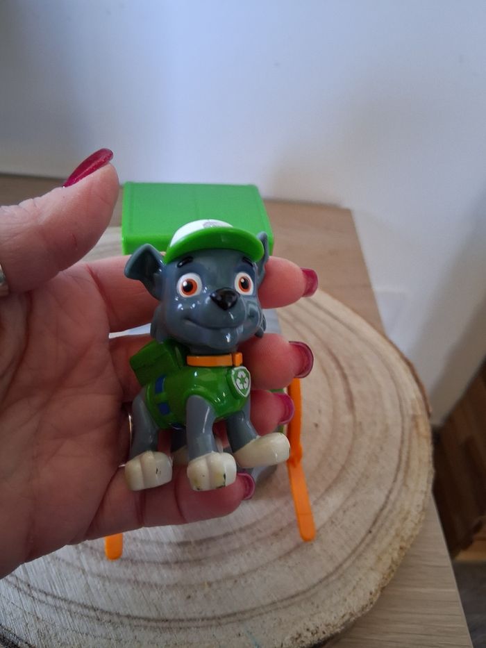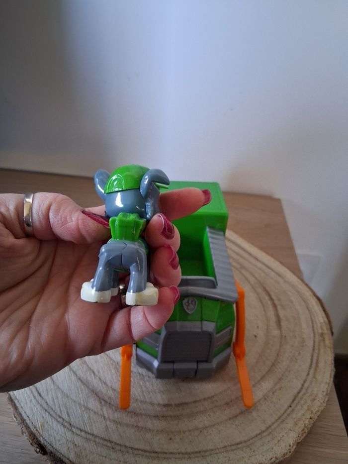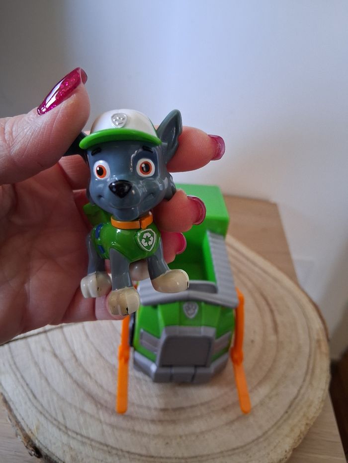 Rocky de la paw Patrouille et son véhicule en très bon état. Quels manque de peinture sur certains endroits de la figurine.