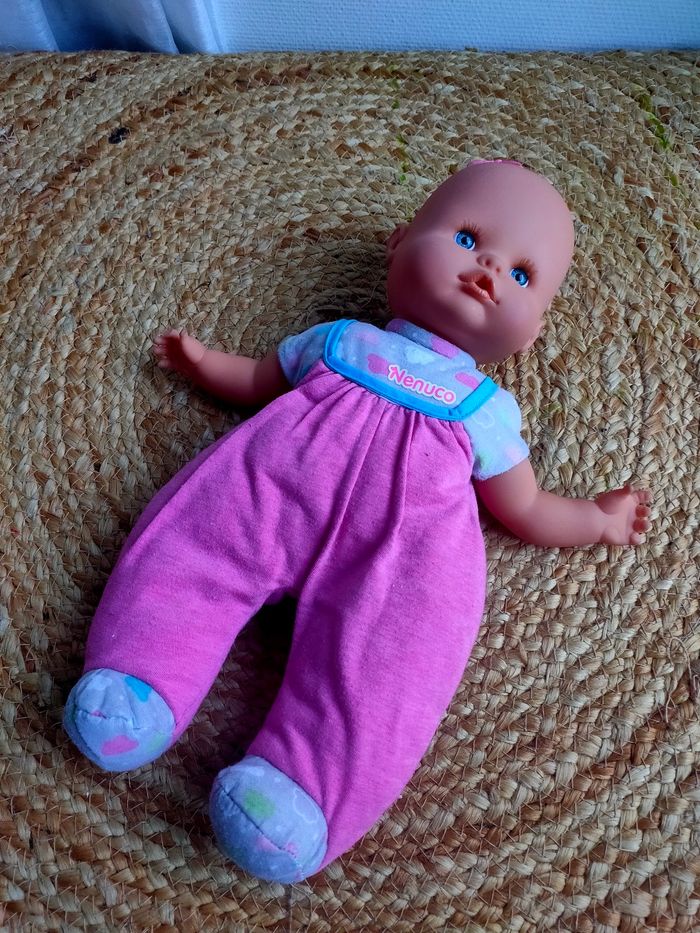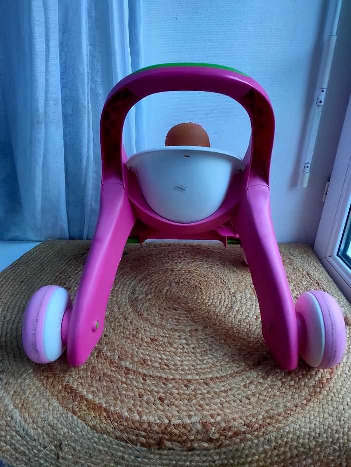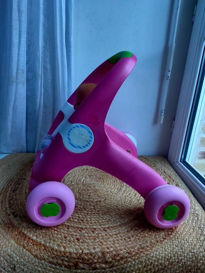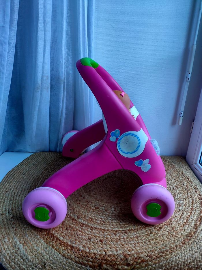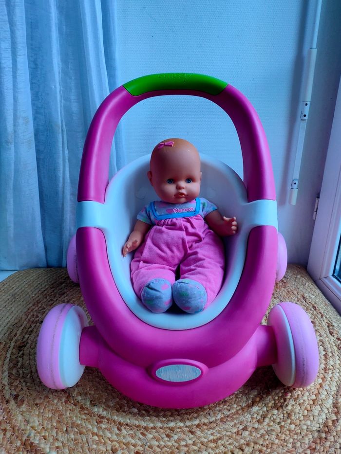 Poussette 1ère âge qui fait également trotteur, permet aux plus petits de faire leurs premiers pas en toute sécurité. L'ergonomie adaptée permet un apprentissage sûr et adapté de la marche grâce à son système de freinage des roues. Elle est en bon état, quelques traces/rayures et les autocollants sont effacés. Vendu avec une poupée corps souple marque Nenuco.