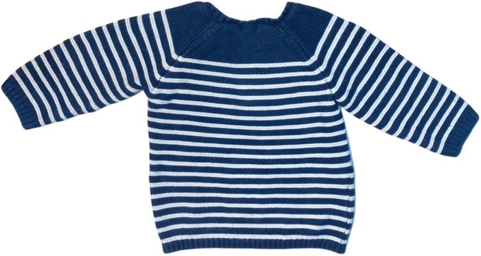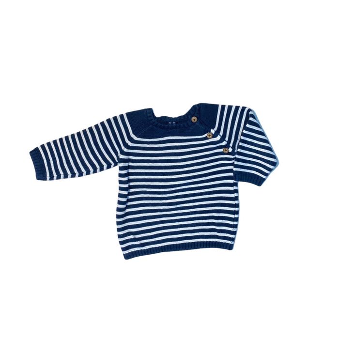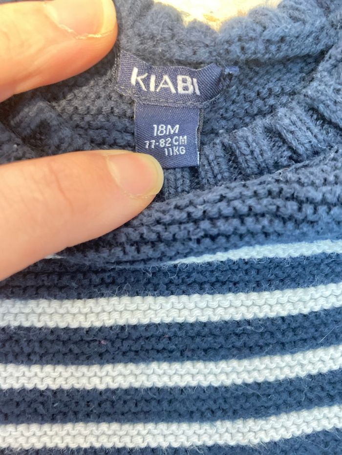 Pull à rayure style marin bleu marine et blanc 3 boutons sur le haut côté gauche pour un habillage et déshabillage facile Marque Kiabi Taille 18 mois En très bon état