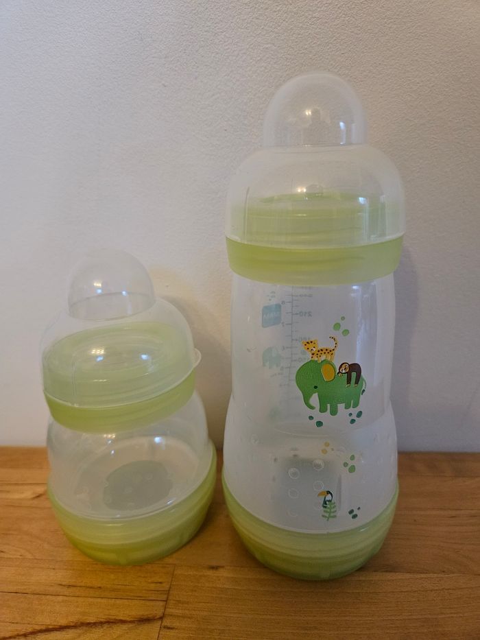 Lot de 2 biberons, marque MAM, contenance 130ml et 260ml. La base du biberon dispose de trous d'aération de manière à réduire l'entrée d'air = biberons pour réduire coliques et gaz. Très bon état. Plus qu'à acheter les tétines de la même marque.