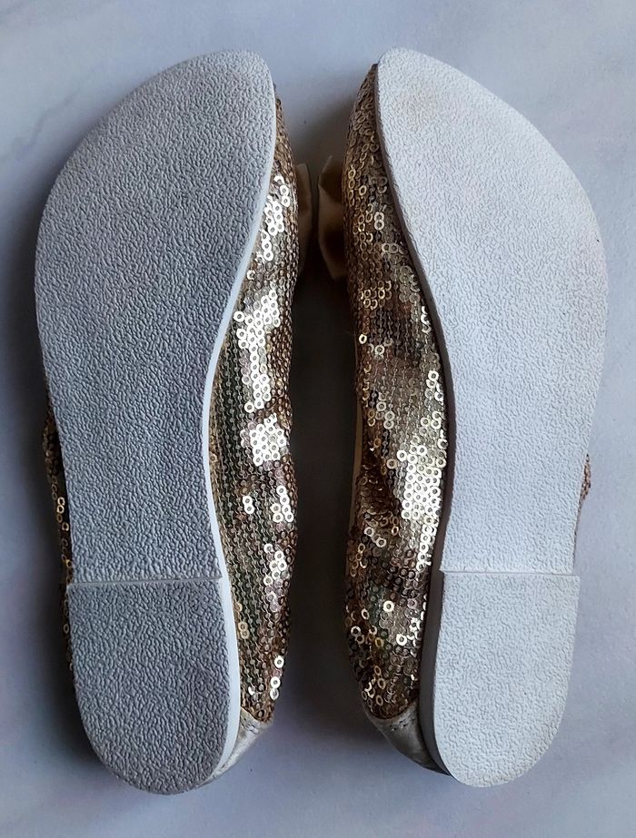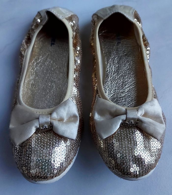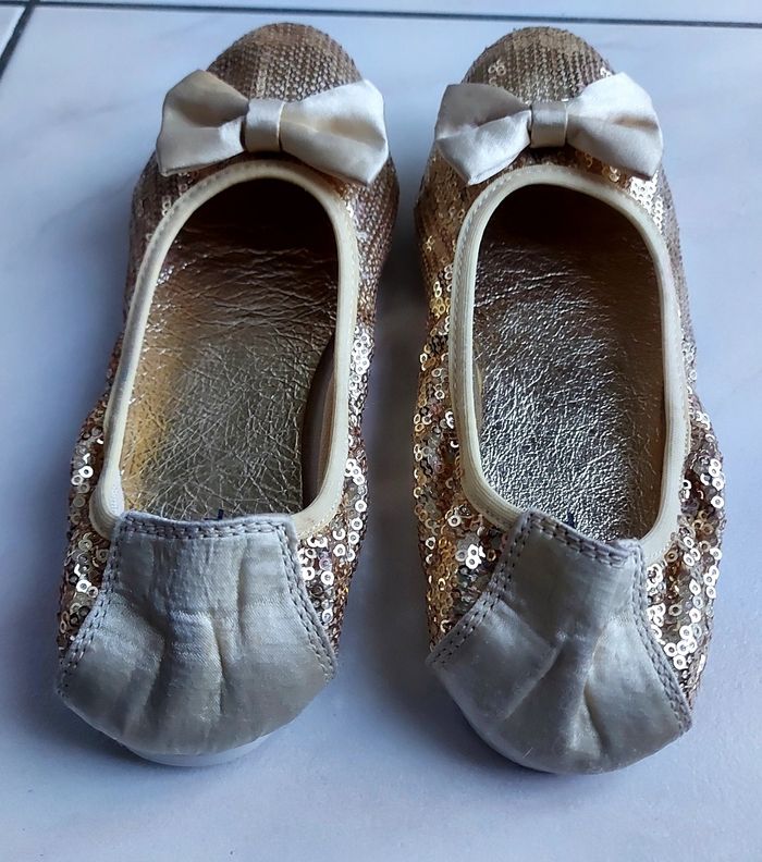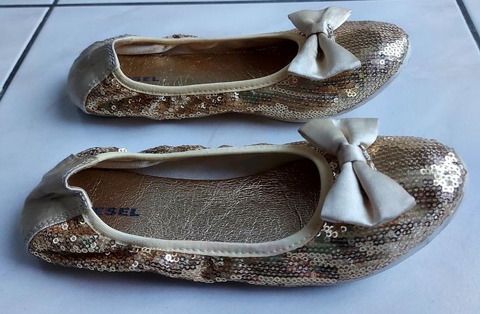 Je vends cette paire de ballerines dorées en sequins de la marque Diesel, en pointure 34-35, idéales pour les événements festifs.