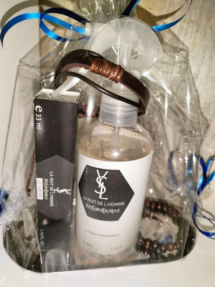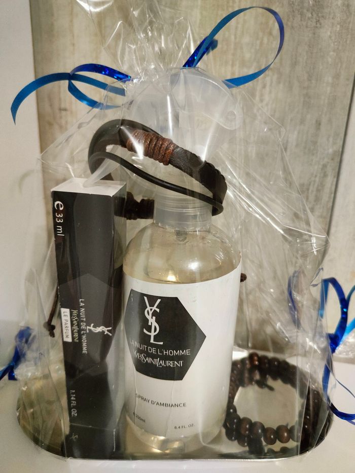 Coffret homme neuf comprenant 1 parfum 1 spray désodorisant textile ( idéal pour les vêtements imprégner de tabac,la voiture,les rideaux...) 2 bracelets 1 plateau de décoration