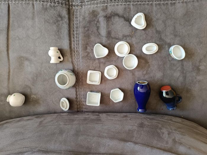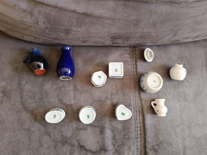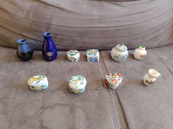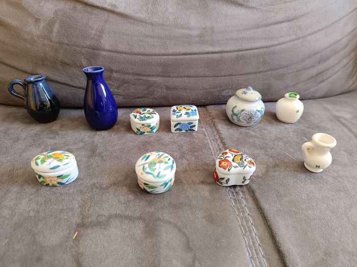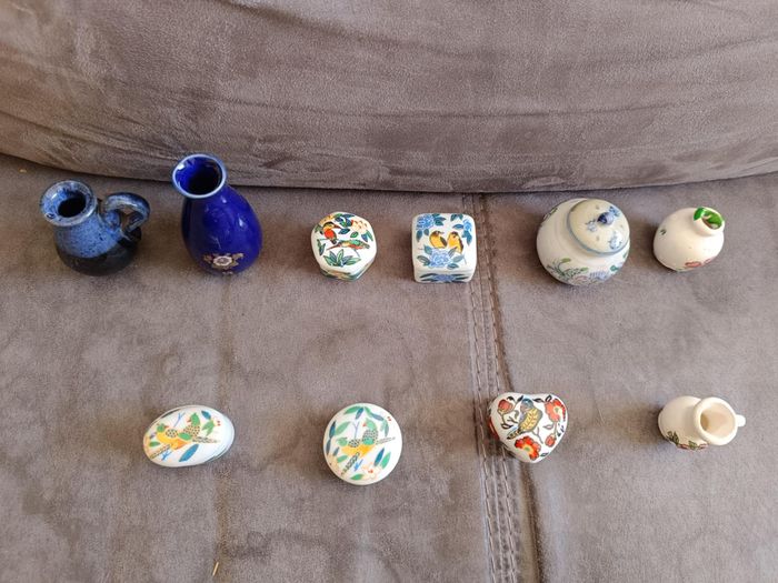 Lot vintage Yves Rocher de boites, cruche, pilulier, vases et bonbonnières avec des motifs de fleurs, perruches et des perroquets